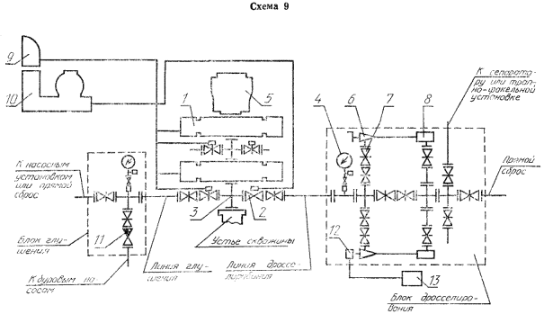 1 - плашечный превентор; 2 - задвижка с гидравлическим управлением; 3 - устьевая крестовина; 4 - манометр с запорным и разрядным устройствами и разделителем сред; 5 - кольцевой превентор; 6 - дроссель с ручным управлением; 7 - задвижка с ручным управлением; 8 - гаситель потока; 9 - вспомогательный пульт; 10 - станция гидропривода; 11 - обратный клапан; 12 - регулируемый дроссель с гидравлическим управлением; 13 - пульт управления гидроприводным дросселем Черт. 9