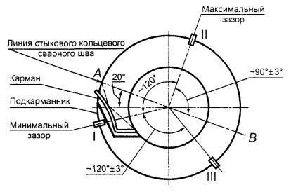 Сборку кольцевых завариваемых зазоров выполняют с помощью центрирующих сборочных планок и дистанционных прокладок, фиксирующих значение требуемого зазора. Для начала ЭШС в зазоре устанавливают карман и подкарманник (рисунок 3) по разметке. В точке I (дно кармана) размер зазора должен быть минимальным (Вmin). В точке II пересечения радиуса, перпендикулярного к линии АВ, с внешней окружностью кромок свариваемых заготовок размер зазора должен быть максимальным (Вmax). Линия АВ проведена через точку пересечения линии стыка кольцевого сварного шва с внешней окружностью кромок свариваемых заготовок и их центр. В точке III