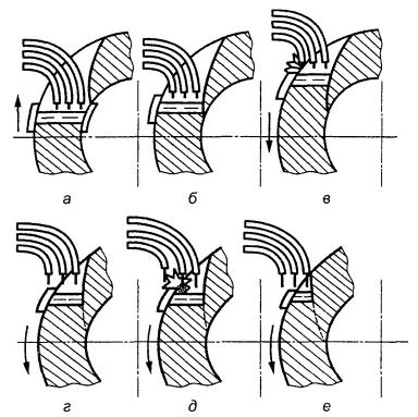 амплитуды. Значение Когда между уровнем шлаковой ванны и верхней частью кармана остается 20-30 мм, устанавливают и прижимают к свариваемым кромкам переднюю часть формирующего устройства так, чтобы ее верхний срез возвышался над верхом кармана от 45 до 50 мм. Зазор между формующим устройством и изделием уплотняют (замазывают) глиной. После поднятия верхней части формирующего устройства на (55±5) мм выше горизонтального диаметра дальнейший подъем аппарата прекращают и включают вращение изделия. При заварке кольцевого зазора необходимо периодически проверять положение электродов в зазоре, режим сварки, подход электродов к формирующему устройству, глубину шлаковой ванны, плотность прилегания формирующего устройства. Температура охлаждающей воды должна быть не более 60 °С на выходе из формирующего устройства. После поворота изделия от 0,3 до 0,4 оборота в процессе сварки начальный участок шва вырезают газовой резкой по шаблону с шириной зазора 28-32 мм. Перед замыканием шва (рисунок 4, а) начальный участок подогревают газовыми горелками вместе с подъемом аппарата для замыкания шва и заканчивают, когда шлаковая ванна касается начала замыкания шва (рисунок 4, б). Вращение изделия прекращают и включают подъем аппарата тогда, когда прямолинейная часть начала шва займет вертикальное положение (рисунок 4, а). При подъеме аппарата до начала шва контролируют расстояние от электродов при их остановке до формирующего устройства. Непосредственно перед подходом уровня шлаковой ванны к началу шва внутреннюю часть формирующего устройства поднимают вдоль начала шва на 50-60 мм и плавно снижают скорость подачи электродов на (30±10) м/ч без изменения напряжения сварки. С момента касания расплавленным шлаком ванны начала шва и по мере сужения плавильного пространства мундштуки сближают и уменьшают амплитуду колебания электродов. После сварки вертикальной части начала шва подъем аппарата прекращают и включают вращение изделия. По мере уменьшения амплитуды колебаний электродов уменьшают напряжение на (4±1) В и снижают скорость подачи электродов, обеспечивая скорость сварки 0,3-0,35 м/ч. При уменьшении амплитуды колебаний до 30 мм нижний электрод выводят из работы, прекратив его подачу и установив на изделие над формирующим устройством поперечную металлическую планку для перегорания электрода, если электрод при возвратно-поступательном перемещении (рисунок 4, в) достигнет планки. После вывода нижнего электрода расстояние между средним и верхним электродами увеличивают с 55 до 85 мм (рисунок 4, г) и уточняют подход электродов к формирующему устройству. По мере уменьшения плавильного пространства выводят из работы средний электрод аналогично выводу нижнего электрода (рисунок 4, д). Повышают напряжение на (6±1) В и скорость подачи верхнего электрода на (50±10) м/ч, корректируя его подход к формирующему устройству (рисунок 4, е). Через (4±1) мин начинают постоянно снижать напряжение и скорость подачи проволоки. Рисунок 4 - Схема заваривания замыкания кольцевого шва При уменьшении плавильного