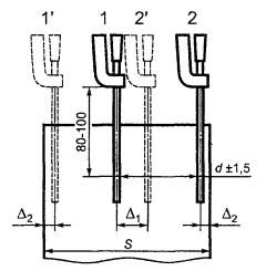 Входной карман и подкарманник выполняют из листовой стали толщиной 30-40 мм. По наружной окружности кольцевого завариваемого зазора приваривают к заготовкам сборочные планки на расстоянии 500-600 мм друг от друга, при этом швы не должны доходить до свариваемых кромок заготовок на 80 мм. Превышение одной кромки над другой не должно быть более 1 мм. Форма плавящегося мундштука определяется конфигурацией завариваемого зазора между заготовками. Плавящийся мундштук представляет собой набор стальных пластин или стержней, снабженных направляющими каналами диаметром от 4,5 до 5 мм для подачи электродной проволоки диаметром 3 мм. Направляющие каналы могут иметь форму спирали, навитой из сварочной проволоки. Длину мундштука определяет длина завариваемого зазора между заготовками с учетом длин входного кармана, выходных планок и конструкции держателя мундштука. По длине мундштука со стороны кромок заготовок на расстоянии от 200 до 250 мм закрепляют изоляторы для предотвращения замыкания электрического тока на корпус изделия при ЭШС. Изоляторы изготовляют из стеклоткани и жидкого стекла или из смеси плавикового шпата и жидкого стекла по НД. Количество электродных проволок в мундштуке n определяют по формуле (2). Полученное значение n округляют до целого числа и вновь подставляют в формулу (2), уточняя значение d. n = (S-40)/d+1. (2) Толщину пластины плавящегося мундштука выбирают в зависимости от расстояния между электродными проволоками согласно таблице 4. Таблица 4 В миллиметрах
