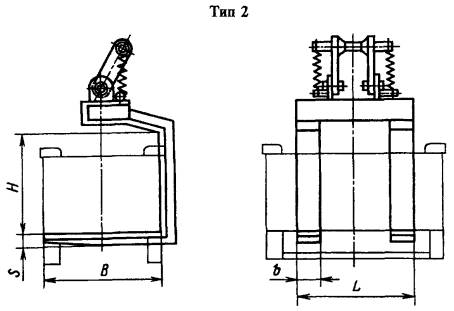 Пример условного обозначения грузозахватного устройства типа 1 с L = 400 мм, В = 450 мм, грузоподъемностью 0,50 т: Устройство грузозахватное 1-40-45-0,50 ГОСТ 15539-81 4. Основные параметры и размеры грузозахватных устройств типа 2 должны соответствовать указанным на черт. 2 и в табл. 2 и 3. Черт. 2 Примечание. Чертеж не определяет конструкцию грузозахватных устройств. Таблица 2 Размеры, мм