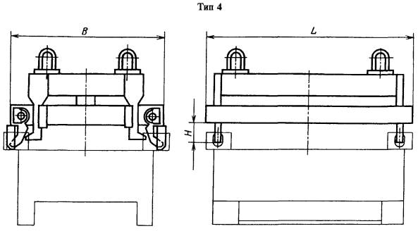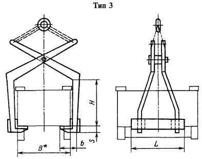 Пример условного обозначения грузозахватного устройства типа 2 с L = 450 мм, В = 600 мм, Н = 560 мм и грузоподъемностью 0,25 т: Устройство грузозахватное 2-45-60-56-0,25 ГОСТ 15539-81 3, 4. (Измененная редакция, Изм. № 1, 2). 5. Основные параметры и размеры грузозахватных устройств типа 3 должны соответствовать указанным на черт. 3 и в табл. 2 и 3. * В рабочем положении. Черт. 3 Примечание. Чертеж не определяет конструкцию грузозахватных устройств. Пример условного обозначения грузозахватного устройства типа 3 с L = 450 мм, В = 600 мм, H = 900 мм и грузоподъемностью 0,50 т: Устройство грузозахватное 3-45-60-90-0,50 ГОСТ 15539-81 6. Основные параметры и размеры грузозахватных устройств типа 4 должны соответствовать указанным на черт. 4 и в табл. 4. Черт. 4 Примечание. Чертеж не определяет конструкцию грузозахватных устройств. Таблица 4 Размеры, мм