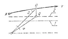 1 - наземная проекция исходной траектории, 2 - наземная проекция измеренной траектории