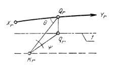 7.5. Участки траектории полета при испытаниях и исходной траектории полета, которые имеют значение для вычисления ЕРNL при наборе высоты, пролете и заходе на посадку для исходных контрольных точек, приведены на черт. 5, а для точек, расположенных сбоку относительно траектории полета, - на черт. 6. ХY - полезный участок измеренной траектории полета, ХrYr - такой же участок соответствующей исходной траектории полета; Q - положение вертолета на измеренной траектории, из которого излучался шум, соответствующий РNLTМ в точке измерения К; Qr - соответствующая точка на исходной траектории полета; Кr - исходная точка измерения шума. QК и QrКr - соответственно измеренный и исходный пути распространения шума. Точка Qr определяется из условия, что QК и QrКr образуют равные углы q с соответствующими траекториями полета, y - угол визирования вертолета.