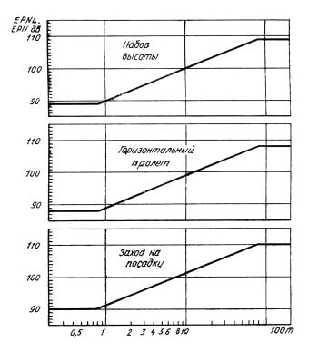 соотношениях 3.3. Расчет максимально допустимых уровней шума по приведенным соотношениям производится с точностью до 0,1 ЕРN дБ. Графики зависимости максимально допустимых уровней шума от взлетной массы вертолета представлены в приложении 1. 3.4. Для модифицированных вертолетов (п. 3.1, перечисление 2) уровни шума не должны превышать уровней шума исходной типовой конструкции. 3.5. Допускаемые отклонения 3.5.1. В одной или двух исходных контрольных точках допускается превышение указанных в п.п. 3.2, 3.4 максимально допустимых уровней шума при выполнении следующих требований: превышение в одной из контрольных точек не должно быть более 3 ЕРN дБ; сумма всех превышений не должна быть более 4 ЕРN дБ; любое превышение допустимых уровней шума должно быть скомпенсировано соответствующим снижением уровней шума в другой точке или точках. 4. ИСХОДНЫЕ УСЛОВИЯ И МЕТОДИКИ ПРОВЕДЕНИЯ СЕРТИФИКАЦИОННЫХ ИСПЫТАНИЙ ПО ШУМУ4.1. Общие условия проведения сертификационных испытаний 4.1.1. Исходные методики полета должны удовлетворять соответствующим требованиям летной годности и быть утверждены в установленном порядке сертифицирующим органом. 4.1.2. Исходная методика набора высоты, горизонтального пролета и захода на посадку определяется по п.п. 4.2-4.4. 4.1.3. Если расчетные характеристики вертолета не позволяют выполнить полеты в соответствии с п.п. 4.2-4.4., то исходные методики могут отклоняться от указанных лишь настолько, насколько этого требуют те расчетные характеристики, которые делают выполнение исходных методик по п.п. 4.2-4.4. невозможным, и утверждаются сертифицирующим органом. 4.1.4. Исходная методика сертификационных испытаний по шуму устанавливается для следующих атмосферных условий: атмосферное давление у поверхности земли на уровне моря - 1013,25 (760), гПа (мм рт. ст.); температура окружающего воздуха у поверхности земли - 25 °С, т. е. МСА+10 °С, за исключением того, что по усмотрению сертифицирующего органа может быть использована другая исходная температура окружающего воздуха 15 °С, т. е. МСА; относительная влажность у поверхности земли - 70 %; штиль. 4.2. Требования исходной методики набора высоты 4.2.1. Вертолет стабилизируется на траектории полета, начиная от точки, находящейся на расстоянии 500 м перед исходной контрольной точкой на высоте 20 м над поверхностью земли, при минимальном гарантированном значении максимальной взлетной мощности установленного двигателя, определяемой исходными условиями окружающей среды или ограничением крутящего момента редуктора, в зависимости от того, какая из величин меньше. 4.2.2. Во время набора высоты выдерживается наивыгоднейшая скорость набора высоты Vнн или наименьшая утвержденная скорость набора высоты после взлета - в зависимости от того, какая из величин больше. 4.2.3. Установившийся набор высоты выполняется при стабилизированных максимальных эксплуатационных оборотах в минуту несущего винта, утвержденных сертифицирующим органом. 4.2.4. При наборе высоты сохраняется постоянная взлетная конфигурация вертолета, за исключением того, что шасси может быть убрано. 4.2.5. Масса вертолета соответствует максимальной взлетной массе, при которой требуется осуществить сертификацию по шуму. 4.2.6. Исходная траектория набора высоты определяется как прямолинейный участок, расположенный от начальной точки (500 м перед исходной контрольной точ