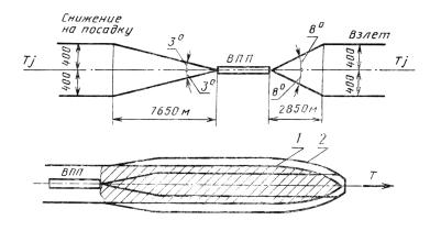 6. При расчете зон воздействия шума следует учитывать отклонение ВС от заданных (идеальных) маршрутов полета. Указанные отклонения определяют по схеме, приведенной на черт. 2. Допускается использовать другие соотношения для оценки отклонения от идеальных маршрутов полета, полученные, например, в результате непосредственных измерений и учитывающие особенности полетов в конкретном аэропорту, должны быть согласованы с руководством эксплуатационного подразделения.