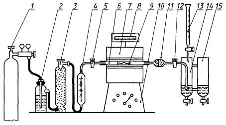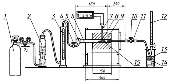 5 Тетраборатный метод определения серы5.1 Сущность метода Метод основан на сжигании навески стали в токе кислорода при 1300 - 1400 °С в присутствии плавня с последующим поглощением сернистого газа окисляющим раствором, состоящим из сернокислого калия и перекиси водорода. Образующуюся серную кислоту оттитровывают раствором тетрабората натрия в присутствии смеси индикаторов метилового красного и метиленового синего. 5.2 Аппаратура Установка для определения серы тетраборатным методом (рисунок 3) состоит из баллона с кислородом или кислородопровода 1, снабженного редукционным вентилем и манометром для пуска и регулирования тока кислорода; склянки Тищенко 2, содержащей раствор марганцовокислого калия 40 г/дм3 в растворе гидроокиси натрия 400 г/дм3; сушильной колонки 3, заполненной в нижней части натронной известью или натронным асбестом (аскаритом), а в верхней части - хлорнокислым магнием, для очистки кислорода сухим способом; ротаметра 4 для измерения расхода кислорода; трехходового крана 5 для пуска кислорода в поглотительный сосуд через печь или минуя печь; огнеупорной муллитокремнеземистой трубки 6 внутренним диаметром 18 - 20 мм и длиной 650 - 800 мм, предназначенной для сжигания навески. Концы трубки должны выступать из печи не менее чем на 200 мм с каждой стороны. Трубку закрывают металлическими затворами или хорошо подогнанными резиновыми пробками с отверстиями, в которые вставляют стеклянные трубки для подключения соединительных трубок. Для предотвращения обгорания резиновых пробок их внутреннюю поверхность закрывают асбестовыми прокладками, надетыми на концы стеклянных трубок. Чтобы удалить примесь серы из огнеупорной трубки, ее перед работой прокаливают при рабочей температуре по всей длине в трубчатой печи 7, обеспечивающей температурный нагрев до 1400 °С; термопары с регулятором 8 для регулирования температуры печи фарфоровой лодочки 9 по ГОСТ 9147, предназначенной для сжигания навески и выдерживающей температуру до 1400 °С. Перед работой лодочки прокаливают в токе кислорода при рабочей температуре. Для хранения прокаленных лодочек используют эксикатор по ГОСТ 25336, шлиф крышки которого не должен покрываться смазывающими веществами; трансформатора 10 для регулирования напряжения печи; стеклянной трубки 11, заполненной стекловатой, для очистки смеси газов от окислов, образующихся при сжигании; крана 12 для изолирования печи от поглотительного сосуда; микробюретки 13; поглотительного сосуда 14; сосуда сравнения 15; барботажной трубки 16; резиновой трубки 17 для подачи кислорода через барботажную трубку в поглотительный сосуд, минуя печь. Рисунок 3 - Установка для определения массовой доли серы тетраборатным методом Соединения между отдельными частями установки должны быть короткими. Крючок, с помощью которого лодочки вводят в трубку для сжигания и извлекают из нее, изготовляют из жаропрочной низкоуглеродистой проволоки квадратного или круглого сечения со стороной квадрата или диаметром от 3 до 5 мм, длиной от 500 до 600 мм. 5.3 Реактивы и растворы Кислород чистотой не менее 99,0 % по ГОСТ 5583. Магний хлорнокислый безводный (ангидрон). Калий марганцовокислый по ГОСТ 20490, раствор 40 г/дм3 в растворе гидроокиси натрия 400 г/дм3: 40 г марганцовокислого калия растворяют при нагревании в 700 - 800 см3 воды. После охлаждения в раствор добавляют 400 г гидроо