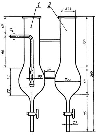 steels. Дата введения 2002-03-01 1 Область примененияНастоящий стандарт устанавливает титриметрические методы определения серы: йодид-йодатный и тетраборатный (при массовой доле серы от 0,002 % до 0,50 %) и методы определения серы, основанные на применении автоматических анализаторов: кулонометрический и инфракрасно-абсорбционный (при массовой доле серы от 0,001 % до 0,50 %) в легированных и высоколегированных сталях. Допускается определение серы титриметрическим методом по международному стандарту ИСО 671-82, приведенным в приложении А, и методом инфракрасной спектроскопии по международному стандарту ИСО 4935-89, приведенным в приложении А. 2 Нормативные ссылкиВ настоящем стандарте использованы ссылки на следующие стандарты: ГОСТ 177-88 Водорода перекись. Технические условия ГОСТ 546-88 (ИСО 431-81) Катоды медные. Технические условия ГОСТ 859-2001 Медь. Марки ГОСТ 2603-79 Ацетон. Технические условия ГОСТ 3118-77 Кислота соляная. Технические условия ГОСТ 4145-74 Калий сернокислый. Технические условия ГОСТ 4199-76 Натрий тетраборнокислый 10-водный. Технические условия ГОСТ 4202-75 Калий йодноватокислый. Технические условия ГОСТ 4232-74 Калий йодистый. Технические условия ГОСТ 4234-77 Калий хлористый. Технические условия ГОСТ 4328-77 Натрия гидроокись. Технические условия ГОСТ 5583-78 (ИСО 2046-73) Кислород газообразный технический и медицинский. Технические условия ГОСТ 9147-80 Посуда и оборудование лабораторные фарфоровые. Технические условия ГОСТ 10163-76 Крахмал растворимый. Технические условия ГОСТ 13610-79 Железо карбонильное радиотехническое. Технические условия ГОСТ 14261-77 Кислота соляная особой чистоты. Технические условия ГОСТ 16539-79 Меди (II) оксид. Технические условия ГОСТ 20490-75 Калий марганцовокислый. Технические условия ГОСТ 24363-80 Калия гидроокись. Технические условия ГОСТ 25336-82 Посуда и оборудование лабораторные стеклянные. Типы, основные параметры и размеры ГОСТ 28473-90 Чугун, сталь, ферросплавы, хром, марганец металлические. Общие требования к методам анализа 3 Общие требованияОбщие требования к методам анализа - по ГОСТ 28473. 4 Титриметрический йодид-йодатный метод определения серы4.1 Сущность метода Метод основан на сжигании навески стали в токе кислорода при температуре 1300 - 1400 °С в присутствии плавня с последующим поглощением сернистого газа водой и титрованием образующейся сернистой кислоты титрованным раствором смеси йодноватокислого калия и йодистого калия в присутствии индикатора крахмала. 4.2 Аппаратура Установка для титриметрического йодид-йодатного метода определения серы (рисунок 1) состоит из баллона с кислородом или кислородопровода 1, снабженного редукционным вентилем и манометром для пуска и регулирования тока кислорода; склянки Тищенко 2, содержащей раствор марганцовокислого калия 40 г/дм3 в растворе гидроокиси калия или натрия 400 г/дм3; сушильной колонки 3, заполненной в нижней части натронной известью или натронным асбестом (аскаритом), а в верхней части - хлорнокислым магнием, для очистки кислорода сухим способом; ротаметра или газового счетчика 4; двухходового крана 5; огнеупорной муллитокремнеземистой трубки 6 внутренним диаметром 18 - 22 мм и длиной 650 - 800 мм, концы которой должны выступать из печи не менее чем на 200 мм с каждой стороны. Трубку закрывают металлическими затворами или хорошо подогнанными резиновыми пробками с отверстиями, в которые вставляют стеклянн