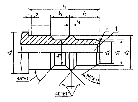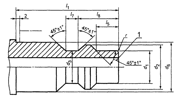 4.2.2 Размеры и допуски втычной части цилиндрических быстроразъемных соединений типа В приведены на рисунке 2 и в таблице 2. 1 - внутренний диаметр (должен быть как можно больше); округление кромки не более 0,5 мм. Следует обеспечить достаточный расход воздуха и прочность втычной части; 2 - расстояние между уступом втычной части и концевой поверхностью приемной части (в соединенном состоянии не должно превышать 1 мм) Рисунок 2 - Втычная часть для номинального давления 1,6 М Па (тип В) Таблица 2 - Размеры втычной части для номинального давления 1,6 МПа (тип В) В миллиметрах