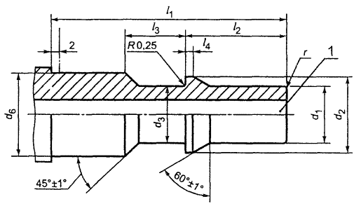 power. Quick-action couplings for nominal pressures 1,0; 1,6 and 2,5 МРа. Дата введения 2002-01-01 1 Область примененияНастоящий стандарт устанавливает размеры и допуски втычной части пневматических быстроразъемных соединений для обеспечения их взаимозаменяемости, а также технические требования, указания по применению и методы испытаний втычной части совместно с приемной частью. Примечание - Конструкция и размеры приемной части оставлены на выбор изготовителя. Настоящий стандарт распространяется на цилиндрические быстроразъемные соединения на номинальные давления 1,0; 1,6 и 2,5 МПа, применяемые в пневматических приводах. Стандарт не распространяется на быстроразъемные соединения с отсечными клапанами для сварочного резального оборудования и смежных производств. Настоящий стандарт распространяется только на размерные параметры изделий, изготовленных в соответствии с настоящим стандартом, и не распространяется на их функциональные характеристики. Дополнительные требования, отражающие потребности экономики страны, приведены в приложении А. Обязательные требования к качеству продукции изложены в 4.1, 4.2.1 - 4.2.3, разделе 5, 6.5, 6.6.1, 6.6.2, 6.8, 8.2.1, 8.3, 8.5.2, 8.6.1, 8.6.2. 2 Нормативные ссылкиВ настоящем стандарте использованы ссылки на следующие стандарты: ГОСТ 9.905-82 Единая система защиты от коррозии и старения. Методы коррозионных испытаний. Общие требования ГОСТ 12.2.101-84 Система стандартов безопасности труда. Пневмоприводы. Общие требования безопасности к конструкции ГОСТ 12.3.001-85 Система стандартов безопасности труда. Пневмоприводы. Общие требования безопасности к монтажу, испытаниям и эксплуатации ГОСТ 6357-81 Основные нормы взаимозаменяемости. Резьба трубная цилиндрическая ГОСТ 8724-81 Основные нормы взаимозаменяемости. Резьба метрическая. Диаметры и шаги ГОСТ 9833-73 Кольца резиновые уплотнительные круглого сечения для гидравлических и пневматических устройств. Конструкция и размеры ГОСТ 15150-69 Машины, приборы и другие технические изделия. Исполнения для различных климатических районов. Категории, условия эксплуатации, хранения и транспортирования в части воздействия климатических факторов внешней среды ГОСТ 17752-81 Гидропривод объемный и пневмопривод. Термины и определения ГОСТ 18460-91 Пневмоприводы. Общие технические требования ГОСТ 19862-93* Пневмоприводы. Методы измерений параметров * На территории Российской Федерации действует ГОСТ 19862-87. 3 ОпределенияВ настоящем стандарте применяют термины по ГОСТ 17752. 4 Размеры и допуски- А - цилиндрические быстроразъемные соединения на номинальное давление 1,0 МПа; - В - цилиндрические быстроразъемные соединения на номинальное давление 1,6 МПа; - С - цилиндрические быстроразъемные соединения на номинальное давление 2,5 МПа. 4.2 На рисунках 1-3 и в таблицах 1-3 приведены размеры и допуски только втычной части. Приемная часть оставлена на выбор изготовителя. К концу втычной части применяют одинаковые требования для присоединения к пневмоустройству, трубе или рукаву. 4.2.1 Размеры и допуски втычной части цилиндрических быстроразъемных соединений типа А приведены на рисунке 1 и в таблице 1. 1 - внутренний диаметр (должен быть как можно больше); 2 - расстояние между уступом втычной части и концевой поверхностью приемной части (в соединенном состоянии не должно превышать 1 мм) Рисунок 1 - Втычная часть для номинального давления 1,0 МПа (тип А) Таблица 1- Ра