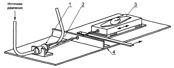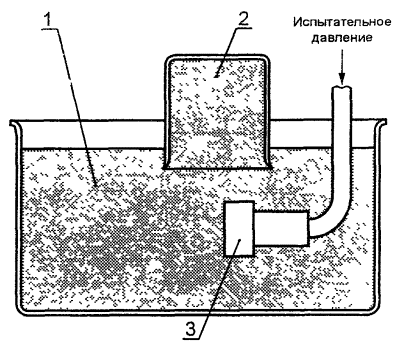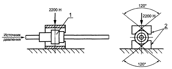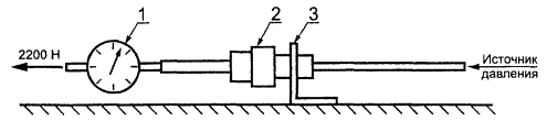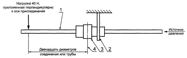 Примечание - Дополнение по А.9. 1 - устройство для присоединения динамометра к запирающей втулке втычной части; 2 - защитная плита; 3 - динамометр; 4 - основание приспособления, показывающего, что функцию можно изменить, чтобы наилучшим образом приспособить к испытываемому соединению Рисунок 5 - Установка для испытаний силы рассоединения 1 - приемная часть соединения; 2 - втычная часть соединения; 3 - направляющий стержень, передающий силу на динамометр и соединяющий источник давления с втычной частью; 4 - динамометр Рисунок 6 - Установка для испытаний силы соединения 1 - сосуд, наполненный изопропиловым спиртом или другой соответствующей жидкостью, 2 - перевернутый мерный цилиндр для сбора пузырьков, наполненный жидкостью, 3 - испытуемое соединение Рисунок 7 - Установка для испытаний утечки 1 - стержень, присоединенный к части соединения, не закрепленной в приспособлении, 2 - приспособление для закрепления части соединения, 3 - испытуемое соединение, 4 - ось запорного устройства Рисунок 8 - Установка для приложения боковой нагрузки 1 - нагревательная или холодильная камера; 2 - части испытуемого соединения Рисунок 9 - Установка для испытаний предельной температуры 1 - испытуемое соединение; 2 - стальные держатели Рисунок 10 - Установка для приложения радиальной силы при испытаниях жесткости конструкции 1 - динамометр; 2 - испытуемое соединение; 3 - приспособление для закрепления части соединения Рисунок 11 - Установка для приложения осевой силы при испытаниях жесткости конструкции 8.2 Проверка соответствия8.2.1 Каждый тип соединения проверяют на соответствие чертежам изготовителя, каталожным листам и таблицам 1-3 настоящего стандарта. 8.2.2 На каждое соединение наносят маркировку, которая не мешает его нормальной работе и позволяет соотносить это соединение с процедурами испытаний и (или) с записями в протоколе. 8.2.3 Измеряют и записывают действительные значения стандартизованных размеров соединения для использования в протоколе испытаний. Измерения выполняют при температуре 20 °С. Примечание - Дополнение по А.10. 8.3 Гидравлические испытания8.3.1 Втычная часть быстроразъемного соединения должна быть подобрана и соединена с соответствующей приемной частью. 8.3.2 Приемную часть присоединяют к источнику гидравлического давления. 8.3.3 Открытый конец приемной части закрывают. 8.3.4 Давление внутри приемной части быстроразъемного соединения повышают до уровня, превышающего в 4 раза давление, рекомендуемое изготовителем. Примечание - После испытаний длительностью 1 мин не должно быть разрушения или остаточной деформации. 8.4 Испытания на коррозионную стойкость8.4.1 Этим испытаниям подвергают только плунжер соединения. Испытания проводят согласно ГОСТ 9.905. 8.4.2 Испытания проводят в течение 24 ч. Результаты испытаний считают приемлемыми, если по окончании испытаний не наблюдают признаков коррозии на наружных поверхностях после удаления испытательного материала. 8.5 Испытания на жесткость конструкции8.5.1 Собранные соединения подвергают действию радиальной нагрузки согласно 6.9, прикладывая ее к рабочей втулке или основной части корпуса с использованием испытательной установки, показанной на рисунке 10. После 1 мин испытаний не должно быть деформаций и разрушений. Примечание - Испытание предназначено для имитации непредусмотренной радиальной нагрузки, например 