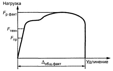 Fp.факт - фактическая разрушающая нагрузка; Fтехн - технологическая нагрузка; Fпр - приемочная пробная нагрузка; Δобщ.факт - общее удлинение (фактическое)