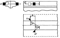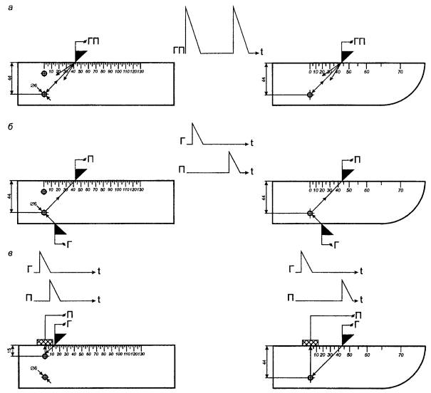 при контроле: 5.5 Условную чувствительность контроля эхо-, зеркальным и дельта-методами при частоте ультразвуковых колебаний более 1,5 МГц следует измерять по образцу СО-2Р (СО-2) или СО-3Р (рисунок 5). Условную чувствительность при контроле эхо-методом допускается измерять по стандартному образцу СО-1Р или СО-1 при температуре, указанной в аттестат-графике. Условную чувствительность при контроле эхо-, зеркальным и дельта-методами допускается измерять по отраслевым стандартным образцам или стандартным образцам предприятия. Условную чувствительность при контроле зеркально-теневым методом измеряют с помощью имитатора дефектов или аттенюатора (рисунок 1) на бездефектном участке рельса или на образце, параметры которых указаны в технической документации на контроль. При частоте ультразвуковых колебаний менее 1,5 МГц эквивалентную чувствительность следует измерять по образцам, указанным в технической документации на контроль. 5.6 Стрелу преобразователя следует определять по образцам СО-3Р (или СО-3 по ГОСТ 14782) или СО-2Р, а положение плоскости падения волны - по образцам СО-3Р или СО-3 (по ГОСТ 14782). 5.7 Угол ввода ультразвуковых колебаний следует измерять по образцам СО-3Р или СО-2Р, или СО-2. 5.8 Погрешность глубиномера следует проверять по образцам СО-3Р или СО-2Р, или СО-2. 5.9 Мертвую зону при контроле эхо-методом на частоте более 1,5 МГц следует проверять по образцам СО-3Р или СО-2Р, а при контроле на частоте менее 1,5 МГц - по образцам, указанным в технической документации на контроль. 5.10 Минимальный условный размер дефекта, подлежащий фиксации при заданной скорости контроля, следует проверять на образце в соответствии с технической документацией на контроль. Допускается при проверке применять радиотехническую аппаратуру, имитирующую сигналы от дефектов заданного условного размера. 5.11 Длительность зондирующего импульса следует определять с помощью высокочастотного осциллографа измерением длительности эхо-сигнала на уровне 0,1. Допускается определять длительность эхо-импульса на образце в соответствии с приложением В. 6 Проведение контроля6.1 Контроль рельсов проводят эхо- или зеркальным, или дельта-, или зеркально-теневым методами, или комбинацией методов продольными l и поперечными t волнами. Схемы включения и расположения преобразователей приведены в таблицах 1 (схемы 1 - 14), 2 (схемы 1 - 8) и 3 (схемы 1 - 4), где Г - вывод к генератору; П - вывод к приемнику. При применении наклонного преобразователя, работающего по совмещенной схеме, прозвучивание осуществляют последовательно в двух взаимно противоположных направлениях. Допускается применять наклонные преобразователи, с помощью которых осуществляют прозвучивание в одном направлении. 6.2 Контроль головки рельса (таблица 1) осуществляют эхо- (схемы 1, 4, 13) и зеркальным (схема 2) методами с помощью наклонных преобразователей. При частоте ультразвуковых колебаний более 1,5 МГц преобразователь включают по совмещенной или раздельной, или раздельно-совмещенной схемам и ориентируют вдоль оси или относительно продольной оси рельса в стороны его боковых граней на угол γ. Номинальные значения угла ввода α и угла γ должны указываться в технической документации на контроль. При частоте ультразвуковых колебаний менее 1,5 МГц преобразователи включают по раздельной схеме и располагают на поверхности катания го