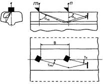 Xmax - максимальное расстояние от линии, проходящей через проекцию точки пересечения угловых отражателей, до линии, проходящей перпендикулярно к поверхности Б через середину (точку ввода луча) преобразователя, установленного в положение, при котором задний фронт первого эхо-сигнала еще пересекается с передним фронтом второго эхо-сигнала от угловых отражателей на уровне линии развертки, мм;