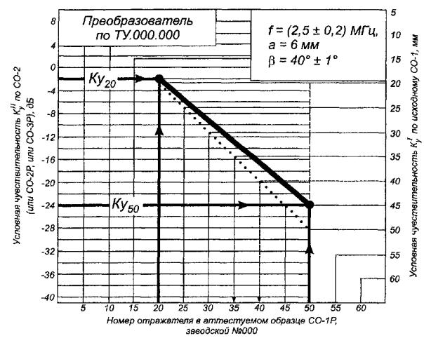 Аттестат-график устанавливает связь условной чувствительности КуI в миллиметрах по исходному стандартному образцу СО-1 с условной чувствительностью КуII в децибелах по стандартному образцу СО-2 (или СО-2Р, или СО-3Р) и номером отражателя диаметром 10Н14 в аттестуемом образце СО-1Р при частоте ультразвуковых колебаний (2,5±0,2) МГц, температуре (20±5) °С и углах призмы β = 40°±1° для преобразователей конкретного типа.