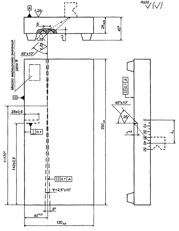 1 Угол ψ определяют угломером или рассчитывают по значениям l и S, измеренным с точностью не менее 0,1 мм; ψ = 2arctg(0,5S/l); значение ψ маркируют на образце.
