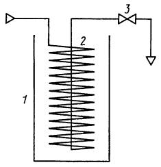 Примечания: 1. Допускается по соглашению с потребителем изменение соотношения пропана и бутана в смеси. 2. Показатель «содержание непредельных углеводородов» при использовании сжиженного углеводородного газа на бытовые нужды не нормируется. (Измененная редакция, Изм. № 3, 5). 1.3. Одоризация сжиженного углеводородного газа проводится по соглашению с потребителем. 1а. ПРАВИЛА ПРИЕМКИ1а.1. Сжиженные газы принимают партиями. За партию принимают любое количество сжиженного газа, однородное по своим показателям качества и оформленное одним документом о качестве. 1а.2. Объем выборок - по ГОСТ 14921. 1а.3. При получении неудовлетворительных результатов испытаний хотя бы по одному из показателей по нему проводят повторные испытания новой выборки. Результаты повторных испытаний распространяются на всю партию. 1а.4. При разногласиях в оценке качества сжиженных углеводородных газов, поставляемых на экспорт, между потребителем и поставщиком арбитражный анализ газа должен выполняться в лабораториях, аккредитованных в установленном порядке. (Измененная редакция, Изм. № 6). 2. МЕТОДЫ ИСПЫТАНИЙ(Измененная редакция, Изм. № 4). 2.2. (Исключен, Изм. № 1). 2.3. Определение жидкого остатка, свободной воды и щелочи 2.3.1. Аппаратура, материалы и реактивы Отстойник вместимостью 100 или 500 см3. Устройство для охлаждения (см. черт. 1), включающее охлаждающий змеевик с игольчатым вентилем и сосуд для охлаждающей смеси. Охлаждающий змеевик изготовляют из медной трубки (ГОСТ 617) длиной 6 м и наружным диаметром 6-8 мм, навитой виток к витку в виде спирали диаметром 60-90 мм. Сосуд для охлаждающей смеси с тепловой изоляцией и размерами под охлаждающий змеевик (внутренний диаметр не менее 100 мм, высота не менее 250 мм). Термометр типа ТН-8 по ГОСТ 400. Термометр ртутный стеклянный по ГОСТ 28498 с пределами градуировки от 0 до 100°С и ценой деления шкалы 1°С. Баня водяная для отстойника с температурой (20 ± 1)°С. Штатив лабораторный для отстойника. Проволока медная диаметром 1,5-2 мм, длиной 200 или 450 мм (в соответствии с высотой отстойника вместимостью 100 и 500 см3). Устройство для охлаждения сжиженного углеводородного газа 1 - сосуд для охлаждающей смеси; 2 - змеевик; 3 - вентиль игольчатый Черт. 1 Гайка накидная к штуцеру пробоотборника с уплотнительной прокладкой, снабженная металлической или пластиковой трубкой длиной 10-15 см и внутренним диаметром 1-3 мм, служащей для налива сжиженного газа в отстойник. Индикаторы тимоловый синий водорастворимый, ч. д. а., и эозин-Н, ч. д. а. Вата гигроскопическая. Вода дистиллированная (рН = 5,4-6,6) по ГОСТ 6709. Смесь охлаждающая, состоящая из крупнокристаллической поваренной соли и льда или ацетона и твердого диоксида углерода, или другие смеси, обеспечивающие требуемую температуру. Допускается применять аппаратуру и материалы с аналогичными техническими и метрологическими характеристиками, а также импортные реактивы по квалификации не ниже указанных в стандарте. 2.3.2. Проведение испытания 2.3.2.1. На штуцер пробоотборника с испытуемым газом навинчивают накидную гайку с чистой сухой отводной трубкой. Открывая нижний вентиль (у пробоотборника типа ПГО-400 - выпускной вентиль) вертикально расположенного пробоотборника, осторожно наливают сжиженный газ через трубку в чистый сухой отстойник. При наливе конец трубки удерживают над поверхностью заполняющей жидкости, отстойник н