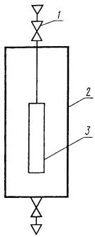где V1 - объем 0,01 н. раствора гидроокиси натрия, израсходованный на титрование раствора в рабочем опыте, см3; V2 - объем 0,01 н. раствора гидроокиси натрия, израсходованный на титрование раствора в контрольном опыте, см3; К- поправочный коэффициент к титру 0,01 н. раствора гидроокиси натрия; 0,00016 - масса серы, эквивалентная 1 см3 0,01 н. раствора гидроокиси натрия; т - масса сжиженного газа, г. 2.5.6. За результат испытания принимают среднее арифметическое двух определений, допускаемые расхождения между которыми не должны превышать: при массовой доле серы 0,005 - 0,01 % ... 10 %, при массовой доле серы 0,01 - 0,1 % ... 5 % относительно наименьшего результата определения. 2.6. Метод испытания на медной пластинке 2.6.1. Сущность метода заключается в воздействии на медную пластинку содержащихся в сжиженных углеводородных газах активных сернистых соединений или свободной серы в условиях, установленных стандартом. 2.6.2. Аппаратура, реактивы, материалы: аппарат (черт. 3) из нержавеющей стали, прошедший гидравлическое испытание при 7,5 МПа (75 кгс/см2); термостат, обеспечивающий постоянную температуру при испытании; термометр ртутный стеклянный от 0 до 100 °С по ГОСТ 28498, с ценой деления шкалы 0,1 °С; пластинки по ГОСТ 859 из меди марки Ml к; или Ml размером (75 ± 1) ´ (12,5 ± 1) ´ (2 ± 0,5) мм с отверстием диаметром 3 мм на расстоянии 3 мм от края пластинки. Параметр шероховатости новых пластинок по ГОСТ 2789 не должен быть более Ra = 0,63; щипцы или пинцет никелированные или из нержавеющей стали; трубка медная соединительная по ГОСТ 617; изооктан эталонный по ГОСТ 12433; вода дистиллированная по ГОСТ 6709; вата медицинская гигроскопическая по ГОСТ 5556; спирт этиловый ректификованный технический по ГОСТ 18300 или спирт этиловый технический по ГОСТ 17299; бумага фильтровальная по ГОСТ 12026; шкурка шлифовальная бумажная по ГОСТ 6456 или шкурка шлифовальная тканевая по ГОСТ 5009; чашка фарфоровая по ГОСТ 9147; порошок шлифовальный по ГОСТ 3647. (Измененная редакция, Изм. № 5). 2.6.3. Подготовка к испытанию Для испытания применяют медные пластинки со свежешлифованной поверхностью. Пластинки шлифуют вдоль обрабатываемой плоскости со всех шести сторон до требуемого класса шероховатости поверхности и ополаскивают спиртом, просушивают на фильтровальной бумаге. Пластинку держат пинцетом или щипцами. Аппарат для испытания медной пластинки на коррозию очищают металлическими щетками и промывают изооктаном. 2.6.4. Проведение испытания В чистый аппарат через верхний вентиль вводят 1 см3 дистиллированной воды при открытом нижнем вентиле для увлажнения стенок аппарата. Снимают верхнюю крышку аппарата и на крючок подвешивают медную пластинку так, чтобы нижний конец ее отстоял от дна аппарата не менее чем на 6 мм. Устанавливают аппарат вертикально, чтобы медная пластинка не коснулась влажной стенки аппарата. Плотно завинчивают верхнюю крышку и закрывают верхний и нижний вентили. Нижний вентиль аппарата соединяют пробоотборником. Аппарат для испытания на медную пластинку 1 - игольчатый вентиль; 2 - корпус; 3 - медная пластинка Черт. 3 Открывают нижний вентиль и вентиль на пробоотборник со сжиженным газом и вводят в прибор сжиженный газ. Для удаления воздуха из прибора открывают верхний вентиль и после заполнения аппарата сжиженным газом последовательно закрывают верхний и нижний вентили, отключают аппарат от пробоотборника с газом. Аппарат 