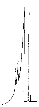 Хроматограмма н-бутана 1 - сумма углеводородов; 2 - метанол; 3 - бензол Черт. 5 2.7.7. Поверка хроматографа 2.7.7.1. Поверка хроматографа - по ГОСТ 8.485. 2.7.7.3. Стабильность градуировочной характеристики определяют по градуировочной смеси, приготовленной по п. 2.7.3.4. Получают 10 хроматограмм градуировочной смеси при тех же условиях, при которых проводилась градуировка хроматографа по п. 2.7.3.5. 2.7.7.4. Высота пиков метанола (амплитуда выходного сигнала) при выбранном масштабе записи должна быть не менее 40 мм. 2.7.7.5. Вычисляют относительное изменение выходного сигнала А по формуле