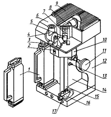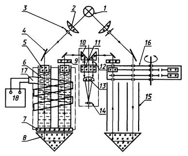 Дата введения 01.07.83 Настоящий стандарт устанавливает метод определения цвета твердых нефтяных парафинов на колориметре КНС-2. Сущность метода заключается в визуальном сравнении цвета определенного объема расплавленного парафина с цветом стандартных светофильтров цветовой шкалы колориметра КНС-2. 1. АППАРАТУРА, РЕАКТИВЫ И МАТЕРИАЛЫКолориметр типа КНС-2 (черт. 1, 2). Значения координат цветности шкалы приведены в приложении. Оптическая схема колориметра КНС-2 1 - осветитель; 2 - конденсатор; 3 - переменная диафрагма; 4 - зеркало; 5, 7 - защитное стекло; 6 - кювета; 8, 10 - призма; 9 - матовое стекло; 11 - светофильтр дневного света; 12 - диафрагма; 13 - окуляр; 14 - выходной зрачок; 15 - эталонный канал; 16 - блок барабанов со светофильтрами; 17- нагреватель кюветы; 18 - блок питания Черт. 1 Общий вид колориметра КНС-2 1 - кювета; 2 - визирное окно; 3 - каретка; 4 - окуляр; 5 - зеркало; 6, 12 - кожух; 7 - диафрагма; 8 - осветитель; 9 - крышка; 10 - блок светофильтров; 11 - рукоятка; 13, 17 - тумблер; 14 - корпус; 15 - эталонный канал; 16 - призма Черт. 2 Стакан номинальной вместимостью не менее 250 см3 в любом исполнении по ГОСТ 25336 или стакан 3 (4, 5) по ГОСТ 9147. Термометры по нормативной документации. Нефрас-С50/170 по ГОСТ 8505. Любой бесцветный бензин или бензиновые алкилатные фракции (для мойки кюветы). Вода дистиллированная с рН 5,4 - 6,6. Спирт этиловый ректификованный технический по ГОСТ 18300. Бумага фильтровальная лабораторная марок ФНБ или ФНС по ГОСТ 12026. (Измененная редакция, Изм. № 2). 2. ПОДГОТОВКА К ИСПЫТАНИЮ2.1. Проверяют чистоту оптических стекол прибора и кюветы. При необходимости кювету промывают бензином и сушат струей чистого сухого воздуха. Оптические стекла промывают спиртом и протирают чистой, неворсистой салфеткой. 2.2. Чистую сухую кювету устанавливают в прибор. Включают колориметр в электросеть, при этом включаются зеленая и красная индикаторные лампочки. Зеленая индикаторная лампочка сигнализирует о включении прибора в электрическую сеть, красная - о включении кюветы на термостатирование. При достижении рабочей температуры кюветы красная лампочка автоматически отключается. Периодическое включение и выключение красной лампочки сигнализирует о поддержании в кювете температуры (75±5) °С. 2.3. Пробу парафина в количестве 130 - 140 г (для одного определения) помещают в химический стакан и расплавляют в термостате или масляной бане при (90±5) °С. Периодически пробу парафина перемешивают термометром или стеклянной палочкой до полного расплавления. Если расплавленная проба парафина мутная или содержит механические примеси, мешающие определению цвета, ее фильтруют через фильтровальную бумагу. Допускается фильтровать парафин под вакуумом. Температура пробы парафина перед заливом в кювету колориметра должна быть (75±2) °С. 3. ПРОВЕДЕНИЕ ИСПЫТАНИЯ3.1. После прогрева кюветы ее быстро выдвигают из гнезда колориметра, заливают в кювету расплавленный парафин до верхнего среза выемки расширенной части кюветы и устанавливают кювету в рабочее положение. Нажатием на рычаг каретки опускают ее в нижнее положение так, чтобы защитное стекло было погружено в испытуемый продукт. После достижения в кювете рабочей температуры (красная лампочка отключена) приступают к определению цвета. 3.2. С помощью рукоятки вращают барабан со светофильтрами и, наблюдая в окуляр, вводят в эталонный канал поочередно светофильтры (на