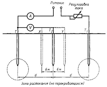 где Примечания 1 Метод 3 может быть использован только в том случае, если расположение электроустановки позволяет использовать вспомогательный электрод. 2 Метод 3 может быть использован для систем TN-S, ТТ и IT. В системе IT может быть необходимым при проведении испытаний соединение точки системы с землей для обеспечения срабатывания УЗО. Рисунок В.3 - Схема проверки УЗО по методу 3 ПРИЛОЖЕНИЕ С(рекомендуемое) Измерение сопротивления заземлителяДля измерения сопротивления заземлителя в качестве примера может быть принята следующая методика (рисунок C.1). Переменный ток неизменной величины пропускают между заземлителем T и вспомогательным электродом заземления T1, расположенном на таком расстоянии, чтобы зоны растекания двух заземлителей не перекрывались. Второй вспомогательный электрод заземления Т2, в качестве которого может использоваться металлический стержень, погруженный в землю, должен быть помещен между Т и T1. Затем измеряют падение напряжения между T и Т2. Сопротивление заземлителя равно напряжению между T и T2, деленному на ток, протекающий между Т и Т1, при условии, что нет перекрытия зон растекания. Чтобы проверить, что сопротивление заземлителя определено правильно, проводят два дополнительных измерения, при которых второй вспомогательный электрод T2; переносят соответственно на 6 м дальше и на 6 м ближе к Т. Если эти три результата существенно не отличаются, то их среднее значение принимают за сопротивление заземления T. Если имеется существенное различие, то испытания повторяют при увеличенном расстоянии между Т и T1. Если испытание проводят на переменном токе промышленной частоты, внутреннее сопротивление используемого вольтметра должно быть не меньше 200 Ом/В. Источник тока, используемый для испытания, должен быть отделен от питающей сети (например, путем использования разделительного трансформатора). Т - заземлитель, подлежащий испытанию, отключенный от всех источников питания; T1 - вспомогательный заземляющий электрод; Т2 - второй вспомогательный заземляющий электрод; X - измененное положение Т2 для проверочного измерения; Y - другое измененное положение Т2 для проверочного измерения. Рисунок С.1 - Схема измерения заземлителя ПРИЛОЖЕНИЕ D(рекомендуемое) Измерение полного сопротивления петли «фаза-нуль»В качестве примеров для измерения сопротивления петли «фаза-нуль» для системы TN могут быть приняты следующие методы. Примечания 1 Предлагаемые методы дают только приближенные величины полного сопротивления петли «фаза-нуль», так как они не учитывают векторную природу напряжения, т.е. условия, существующие во время реального замыкания на «землю». Однако эта степень приближенности приемлема при незначительном измеряемом реактивном сопротивлении цепи. 2 Рекомендуется до выполнения измерения сопротивления петли «фаза-нуль» провести испытание на непрерывность (612.2) между нейтральной точкой и открытыми проводящими частями. Метод 1 Измерение сопротивления петли «фаза-нуль» способом падения напряжения (см. рисунок D.1) Примечание - Следует обратить внимание на определенные трудности при применении данного метода. Рисунок D.1 - Схема измерения по методу 1 Напряжение в испытуемой цепи измеряют с включенным и отключенным сопротивлением нагрузки, и сопротивление петли «фаза-нуль» рассчитывают по формуле
