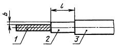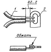 5.2 Выбор варианта конструкции разделки провода следует проводить в зависимости от марки провода и условий эксплуатации аппаратуры. 5.3 Для проводов, имеющих защитный покров из волокнистых материалов, следует применять ступенчатую конструкцию разделки (рисунок 1), для прочих проводов - бесступенчатую (рисунок 2). 5.4 При ступенчатой конструкции разделки (рисунок 1) размер ℓ должен быть равен (3 - 6) b, где b - толщина изоляции по техническим условиям, мм. При отсутствии данных в технических условиях величину b определяют экспериментально. Размер ступени должен быть увеличен: - на 3 - 4 мм, если защитный покров крепят в соответствии с рисунком 11 (для проводов с малой толщиной изоляции) и рисунком 13; - на длину изоляционной части хвостовика кабельного наконечника ℓ1 плюс 3 - 4 мм, если жила провода крепится к кабельному наконечнику в соответствии с рисунком 3. 5.5 Изоляция и защитный покров провода не должны иметь повреждений (прожогов, надрезов и т.д.). Длина местного потемнения и оплавления у торца изоляции не должна превышать 1 мм, а для проводов с площадью сечения более 0,75 мм2 - 2 мм. 5.6 Волокнистая изоляция не должна выступать из-под пластмассовой более чем на 1 мм (рисунок 4). 5.7 Изоляция или защитный покров на конце провода должны быть закреплены, если они не обладают достаточной механической прочностью к различным воздействиям на них при монтаже и эксплуатации аппаратуры (раскручиваются, разлохмачиваются, сдвигаются и т.п.). 1 - жила; 2 - изоляция; 3 - защитный покров Рисунок 1 1 - жила; 2 - изоляция Рисунок 2 1 - жила; 2 - изоляция; 3 - защитный покров Рисунок 3 1 - жила; 2 - изоляция пластмассовая; 3 - волокнистая изоляция Рисунок 4 5.8 Конструкция крепления изоляции или защитного покрова на конце провода зависит от их механической прочности, адгезионных свойств материалов и условий эксплуатации аппаратуры. Способы крепления изоляции и защитного покрова приведены на рисунках 5 - 13. 5.9 Длина неизолированного участка жилы должна быть достаточной для обеспечения ее механического крепления к контакт-детали. 5.10 Многопроволочная жила должна быть скручена в направлении заводского повива. Отслаивание отдельных проволочек жилы не допускается. В проводах, имеющих жилу, скрученную из групп проволочек, при разделке должен быть сохранен или восстановлен шаг скрутки предприятия-изготовителя. 5.11 Длина нелуженого участка жилы у торца изоляции не должна превышать 1 мм (рисунок 14). 5.12 Перечень типов проводов с вариантами конструкций их разделки приведен в приложении А. 6 Технические требования к конструкциям крепления жил проводов6.1 Технические требования к конструкциям крепления жил проводов к контакт-деталям 6.1.1 Конструкции крепления жил проводов, подготовленных по вариантам, приведенным в таблицах 1 и 2, к контакт-деталям, показаны на рисунках 15 - 36. 6.1.2 К плоским контакт-деталям провода сечением не более 0,35 мм2 должны быть прикреплены с выполнением полного оборота жилы провода вокруг контакта (рисунки 15 - 20), провода с площадью сечения более 0,35 мм2 - с выполнением не менее 3/4 оборота (рисунки 21 - 24). К цилиндрическим контакт-деталям из алюминия, плакированного медью, провода всех сечений должны быть прикреплены с выполнением полного оборота жилы вокруг контакта (рисунки 25 - 27). 6.1.3 Жила провода, закрепленная на контакт-детали, должна плотно ее огибать. Изгиб контакт-детали не допу