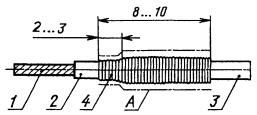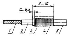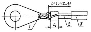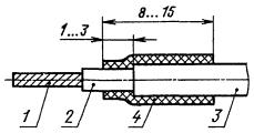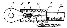 1 - наконечник; 2 - хвостовик наконечника; 3 - токопроводящая жила; 4 - электроизоляционная трубка на клее или термоусаживаемая трубка; 5 - электроизоляция провода; 6- защитный покров Рисунок 38