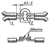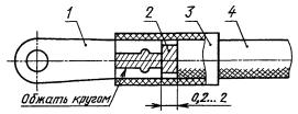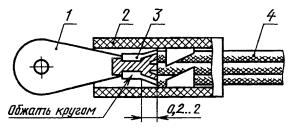 1 - плоская контакт-деталь; 2 - провод, 3 - плата Рисунок 32 1 - электроизоляционная трубка; 2 - плоская контакт-деталь; 3 - провод; 4 - плата Рисунок 33 1 - провод; 2 - электроизоляционная трубка; 3 - плоская контакт-деталь, 4 - плата Рисунок 34 1 - провод; 2 - плоская контакт-деталь; 3 - электроизоляционная трубка; 4 - плата Рисунок 35 1 - провод; 2 - плоская контакт-деталь, 3 - плата Рисунок 36 6.1.12 Проходные последовательные перемычки должны быть выполнены из одного отрезка неизолированного провода (рисунки 34, 35). Перемычки между соседними лепестками должны быть выполнены концом закрепляемого провода (рисунок 36). 6.2 Технические требования к конструкциям крепления жил проводов к наконечникам 6.2.1 Конструкции крепления жилы провода к кабельному наконечнику должны соответствовать рисункам 37 - 39. Для обеспечения надежного крепления провода его изоляция должна быть обжата хвостовиком кабельного наконечника. Повреждение изоляции провода при обжиме его наконечником не допускается. 6.2.2 При креплении к кабельному наконечнику жилы провода с защитным покровом из волокнистого материала разделка провода должна соответствовать требованиям 5.4. 6.2.3 При креплении к кабельному наконечнику жилы провода с наружной лавсановой или капроновой оплеткой хвостовик кабельного наконечника должен быть обжат по оплетке. Оплетка перед креплением провода к кабельному наконечнику должна быть покрыта лаком или клеем на длину не менее 10 мм. 6.2.4 При креплении к кабельному наконечнику жилы экранированного провода экран не должен входить в электроизоляционную трубку. 6.2.5 При пайке к кабельному наконечнику нескольких жил проводов с полиэтиленовой или поливинилхлоридной изоляцией длина неизолированного участка провода должна быть в пределах 5 - 10 мм. Электроизоляционная трубка должна перекрывать неизолированные участки жил и участок спекания изоляции на 5 - 8 мм. 6.2.6 Кабельный наконечник с обжимом жилы следует применять только для проводов с площадью сечения более 4 мм2 (рисунок 37). 6.2.7 К роликовому кабельному наконечнику должны быть прикреплены провода с площадью сечения не менее 0,35 мм2. Конструкция крепления жилы провода к роликовому кабельному наконечнику должна соответствовать рисунку 40. Жила провода должна быть разделена на две ровные пряди. Проволоки каждой пряди должны быть скручены между собой в сторону свивания жилы не менее чем на 1,5 витка. Пайка должна быть произведена по дуге не менее 220°. 6.2.8 При креплении к контактному зажиму жилы провода с площадью сечения не более 0,5 мм2 на нее должен быть надет трубчатый наконечник и соединен пайкой в соответствии с рисунком 41. 6.2.9 Под одним контактным зажимом должно быть подключено не более трех наконечников. Подключаемый наконечник должен быть закреплен между двумя контактирующими поверхностями; между гайкой и наконечником должна быть установлена шайба. Присоединение к контактному зажиму провода любого сечения без кабельного наконечника не допускается. 6.3 Технические требования к конструкциям крепления жил проводов к выводам ЭРЭ 6.3.1 Крепление жил проводов к выводам ЭРЭ должно быть выполнено в соответствии с 6.1.2 - 6.1.4 и 6.1.12. 6.3.2 Конструкция крепления жил проводов к контактам панелей пальчиковых ламп должна быть выполнена в соответствии с рисунком 42, к контактам ламповых октальных панелей - согласно рисунку 43. 6.3.3 При креплении ж