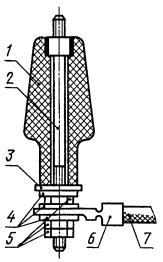 1 - электроизоляционная трубка на клее Примечание - При надевании трубок с натягом устанавливать их следует без клея Рисунок 47 1 - провод; 2 - плоская контакт-деталь; 3 - изолятор Рисунок 48 1 - втулка; 2 - изолятор; 3 - провод Рисунок 49 1 - изолятор; 2 - провод; 3 - электроизоляционная трубка Примечание - При надевании трубок с натягом устанавливать их следует без клея Рисунок 50 1 - изолятор; 2 - шпилька; 3 - шайба; 4 - шайба; 5 - гайка; 6-наконечник; 7- провод Рисунок 51 ПРИЛОЖЕНИЕ А(справочное) Перечень типов проводов и варианты конструкций их разделкиТаблица А.1