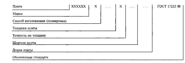 4.2.7 Теоретическая масса плиты вычислена при плотности 2,85 г/см3, что соответствует плотности алюминиевого сплава марки В95 и приведена в приложении А. Для вычисления теоретической массы плит из алюминия и алюминиевых сплавов других марок следует пользоваться переводными коэффициентами, указанными в приложении Б. 4.2.8 Марку алюминия или алюминиевого сплава, плакировку, размеры плит и точность изготовления плит потребитель указывает в заказе. При отсутствии требований в заказе точность изготовления определяет изготовитель. Условные обозначения плит при заказе проставляют по схеме: