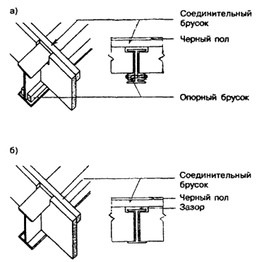 6.4.4 В случаях, когда чистый пол состоит из пригнанных деревянных досок толщиной не менее 18 мм, уложенных под прямым углом к балкам перекрытия, которые размещены с шагом не более 600 мм, черный пол может выполняться из фанеры или гипсоволокнистых листов толщиной не менее 12 мм. Такой черный пол допускается предусматривать также под покрытие чистого пола из бетонной или керамической плитки. 6.4.5 Элементы черного пола в пределах помещения должны иметь шпунтовые соединения или стыковаться на деревянных брусках сечением 38´38 мм, прибитых гвоздями к элементам каркаса. 6.4.6 При монтаже черных полов должны соблюдаться следующие требования: - черный пол из фанеры должен укладываться так, чтобы волокна древесины в верхнем слое были перпендикулярны балкам перекрытия, а соединения, параллельные этим балкам, располагались вразбежку; - черный пол из древесностружечных плит должен монтироваться так, чтобы короткая сторона плит была перпендикулярна балкам перекрытия, а соединения, параллельные этим балкам, располагались вразбежку; - черный пол под упругое покрытие чистого пола должен прибиваться к опорам строительными гвоздями трефовыми с перемычкой по ГОСТ 4028; - черный пол из пиломатериалов должен укладываться под углом не менее 45° к балкам и полностью опираться концами на сплошную опору; пиломатериалы для черного пола должны иметь одинаковую толщину и быть шириной не более 180 мм. 6.4.7 Верхняя поверхность и все края черного пола из материалов на древесной основе, устраиваемого в ванных комнатах, кухнях, постирочных и других помещениях, где возможно замачивание пола, должны обрабатываться гидрофобизирующими веществами для защиты от увлажнения. Таким же образом должны обрабатываться верхняя поверхность и края всех элементов черного пола заводского изготовления из материалов на древесной основе, если не обеспечивается надежная защита их от увлажнения в процессе транспортирования и хранения. 6.5 Подшивка потолка 6.5.1 Для подшивки потолка могут использоваться листовые и плитные обшивочные материалы, а также пиломатериалы, виды и требования к минимальной толщине которых указаны в таблице 7.3. Примечание - При использовании данных таблицы 7.3 следует вместо шага стоек учитывать шаг балок. 6.5.2 В случаях, когда размеры листов или плит подшивки меньше расстояний между балками перекрытия, а также в случаях применения для подшивок материалов с недостаточной жесткостью, подшивки должны крепиться к балкам по обрешетке, которая должна удовлетворять требованиям, указанным в таблице 6.3. Таблица 6.3