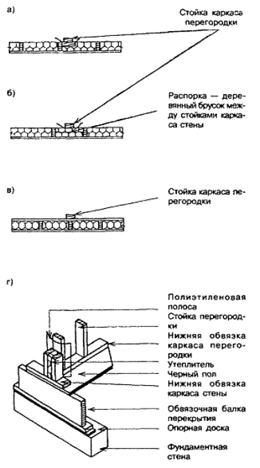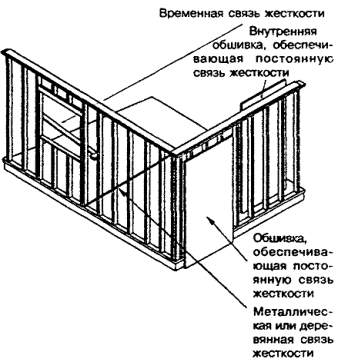 6.6.4 Клей, используемый для наклейки настила пола из паркетных щитов и клепок, должен подходить для соединения древесины с материалом черного пола. 6.6.5 Упругие покрытия пола должны приклеиваться к основанию клеями, совместимыми с материалом покрытия и стойкими к воде и щелочам. 7 СТЕНЫ И ПЕРЕГОРОДКИСНиП 31-02 предъявляет к стенам дома требования по прочности и деформативности при расчетных значениях воздействий и нагрузок, пределу огнестойкости и классу пожарной опасности, долговечности. Наружные стены должны соответствовать также требованиям по сопротивлению теплопередаче из условий энергосбережения, по защите от проникновения внутрь конструкции атмосферной влаги и воздуха, по предотвращению накопления конденсата водяных паров внутри конструкции, а также по обеспечению снижения звукового давления от внешних источников шума до нормативного уровня. Внутренние стены, разделяющие жилые блоки в блокированном доме, должны удовлетворять требованиям к индексу изоляции воздушного шума. Требования к обеспечению теплоизоляции, защиты от воздухопроницания и паропроницания стен приведены в разделе 9. Требования к устройству наружной отделки стен, а также к обеспечению защиты от проникновения атмосферной влаги внутрь конструкций наружных стен приведены в разделе 10. 7.1 Общие требования к конструкции 7.1.1 Стены и перегородки состоят из деревянного каркаса, обшивки (наружной и внутренней по отношению к ограждаемому помещению) и отделочных (облицовочных) слоев. При необходимости в стенах располагают слои, обеспечивающие теплозвукоизоляцию, пароизоляцию и защиту от проникновения воздуха и воды. Каркас стен воспринимает нагрузки от перекрытий и крыши дома. На каркас перегородок нагрузки от перекрытий и крыши не должны передаваться. 7.1.2 Положения 6.1.2 - 6.1.9 настоящего Свода правил распространяются также на стены домов. 7.2 Устройство каркаса 7.2.1 Каркас стен (рисунок 7.1) состоит из вертикальных стоек и горизонтальных элементов (верхняя и нижняя обвязки, перемычки над оконными и дверными проемами). Стойки в пределах каждого этажа опираются на нижние обвязки каркаса стены, которые через элементы каркаса перекрытий передают нагрузку на верхние обвязки каркаса стен нижерасположенного этажа (каркас «платформенного» типа с поэтажными стойками). Обшивки каркаса, если они выполняются из жестких плитных или листовых материалов или из пиломатериалов, обеспечивают жесткость каркаса при восприятии ветровых нагрузок и предотвращают потерю устойчивости стоек. При отсутствии жестких обшивок должны использоваться диагональные связи жесткости или распорки в соответствии с требованиями 7.2.5. Рисунок 7.1 - Каркас стены Вертикальные и горизонтальные элементы каркаса стен разделяют внутреннее пространство стены на замкнутые ячейки и выполняют функции противопожарных диафрагм. 7.2.2 Элементы каркаса стен должны выполняться из пиломатериалов хвойных пород не ниже 2-го сорта по ГОСТ 8486. Приведенные в настоящем Своде правил положения относятся к каркасу стен со стойками сплошного прямоугольного сечения. Допускается использование стоек другой конструкции (например, стоек решетчатой конструкции). 7.2.3 Сечение и шаг стоек каркаса стен должны рассчитываться в зависимости от положения стоек по высоте дома и от передаваемой на них нагрузки. При этом дол