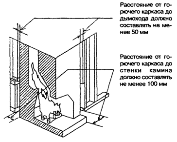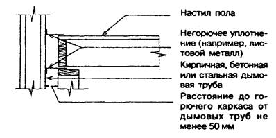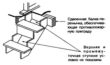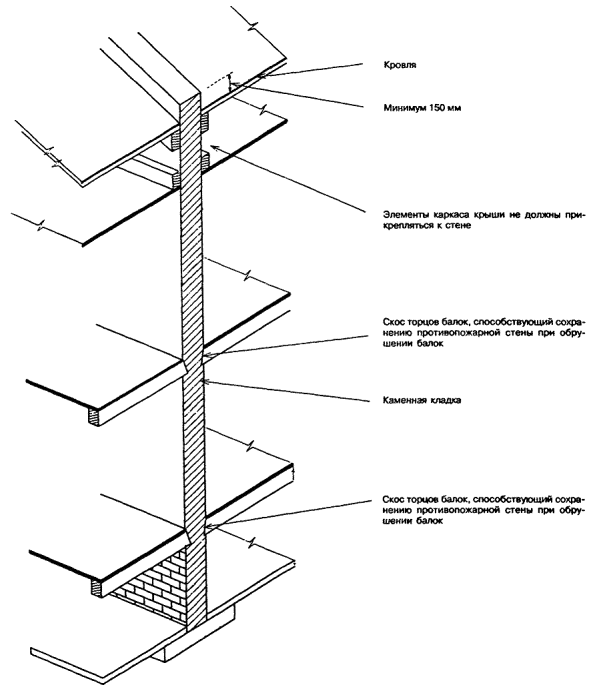 7.3.5.3 Все края листов или плит обшивок должны располагаться над опорами (элементами каркаса или обрешетки). 7.3.5.4 Подготовка обшивки каркаса стен к отделке должна выполняться в полном соответствии с технологическими инструкциями по строительству домов данной системы. 7.3.5.5 Дополнительные требования к креплению наружной защитной обшивки каркаса наружных стен приведены в разделе 10. 7.4 Требования к противопожарным стенам 7.4.1 Противопожарные стены, разделяющие блокированный дом на пожарные отсеки и на жилые блоки, должны удовлетворять требованиям 5.13 СНиП 21-01 и 6.10 СНиП 31-02. 7.4.2 При каменных стенах выполнение требования 7.4.1 достигается за счет того, что прогоны или балки перекрытия, опирающиеся с обеих сторон на стену, не соединяются между собой. По их концам должны устраиваться скосы, предотвращающие разрушение стены при обрушении балок или прогонов (рисунок 7.5). Рисунок 7.5 - Каменная противопожарная стена В местах опирания балок или прогонов на противопожарные стены из бетона или каменной кладки в этих стенах допускается предусматривать гнезда. Размер сечения стены в месте гнезда должен быть не менее 120 мм для стены 1-го типа и 60 мм для стены 2-го типа. 7.4.3 В каркасных стенах выполнение требования 7.4.1 достигается устройством сдвоенного каркаса стен и размещением между каркасами смежных блоков самонесущей противопожарной стены 2-го типа со стальным каркасом, облицовками из гипсокартонных или гипсоволокнистых листов толщиной не менее 15,9 мм и негорючим утеплителем (рисунок 7.6). Допускается эту стену выполнять с деревянным каркасом при сдвоенных облицовках общей толщиной не менее 25 мм. Рисунок 7.6 - Межквартирная противопожарная стена 2-го типа каркасной конструкции Связь между противопожарной стеной и каркасами смежных блоков осуществляется самонарезающими винтами через дискретные легкоплавкие элементы, например, в виде отрезка профиля из термопласта. Число таких связей должно быть достаточным, чтобы обеспечить устойчивость стены в процессе строительства и после обрушения каркаса одного из блоков при пожаре. 7.4.4 В случаях, когда наружные стены и покрытия выполнены с применением материалов групп горючести Г2, Г3 и Г4 (отдельные дискретно расположенные элементы и пленки общей массой до 5 кг/м2 площади стены или покрытия не учитываются), противопожарные стены должны пересекать эти конструкции и выступать за их пределы: противопожарные стены 1-го типа над кровлей - не менее чем на 0,6 м, за наружную плоскость стены - не менее чем на 0,3 м; противопожарные стены 2-го типа над кровлей и за наружную плоскость стены - не менее чем на 0,15 м. В случаях, описанных в 7.4.5, противопожарные стены могут не пересекать наружные стены. 7.4.5 В случаях, когда противопожарная стена разделяет пожарные отсеки или жилые блоки, наружные стены которых находятся под углом 135° и менее, участки наружных стен, образующие этот угол, общей длиной 1,2 м для смежных жилых блоков и 3,0 м для смежных пожарных отсеков должны (независимо от этажности дома) иметь предел огнестойкости и класс пожарной опасности не ниже требуемых для соответствующей противопожарной стены (рисунок 7.7). Рисунок 7.7 - Варианты устройства противопожарной стены в местах примыкания соседних блоков 7.5 Обеспечение звукоизоляции 7.5.1 Выполнение требования СНиП 31-02 к индексу изоляции воздушного шума стеной, раздел