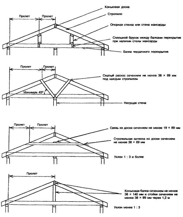 8 КРЫШАСНиП 31-02 предъявляет к крыше дома требования по несущей способности, степени огнестойкости и классу пожарной опасности, долговечности. Крыша должна соответствовать также требованиям: защиты от проникновения в конструкции крыши и дома дождевой и талой воды, а также снега; сопротивления теплопередаче из условий энергосбережения; защиты от паропроницания и воздухопроницания. 8.1 Общие требования к конструкции 8.1.1 Крыши выполняются скатными или плоскими. К скатным относятся крыши с уклоном 1:6 и более, к плоским - крыши с уклоном менее 1:6. Плоские крыши должны иметь уклон не менее 1:50 для обеспечения стока дождевой и талой воды. В скатных крышах в пространстве между кровлей и горизонтальным перекрытием верхнего этажа (чердачным перекрытием) устраивается чердак или мансарда. Плоские крыши выполняются бесчердачными. 8.1.2 Крыша дома состоит из деревянного несущего каркаса, к которому крепится: - сверху - сплошной кровельный настил или обрешетка, на котором располагается кровля, обеспечивающая необходимую защиту от проникновения атмосферных осадков и талой воды; - снизу - подшивка потолка, над которой располагается пароизоляция и утеплитель, обеспечивающий необходимую теплоизоляцию. В домах высотой 3 этажа подшивка потолка должна быть выполнена из гипсокартонных листов типа ГКЛ или гипсоволокнистых листов типа ГВЛ толщиной не менее 12,5 мм (по требованиям пожарной безопасности). Требования к обеспечению теплоизоляции и защиты от паропроницания приведены в разделе 9. 8.1.3 В состав конструкций скатных и плоских крыш дома входят карнизы, обеспечивающие частичный отвод стекающей с кровли талой и дождевой воды от наружных стен, а в состав конструкций скатных крыш - при необходимости, также торцевые фронтоны с карнизами над ними. 8.1.4 В конструкциях крыш необходимо предусматривать вентиляционные отверстия, позволяющие выводить наружу влажный воздух, проникающий на чердак из отапливаемых помещений. 8.1.5 Для скрепления элементов каркаса крыш могут использоваться крепежные детали, не предусмотренные в настоящем разделе (например, металлозубчатые пластины). В этом случае прочность соединений должна быть не менее обеспечиваемой предусмотренными способами, что должно быть подтверждено расчетами или испытаниями. 8.1.6 Положения 6.1.2 - 6.1.9 настоящего Свода правил распространяются также на крыши домов. 8.2 Несущий каркас крыши 8.2.1 Общие положения 8.2.1.1 В скатных крышах несущий каркас состоит из балок чердачного перекрытия, стропил, а также коньковых досок или балок и, при необходимости, промежуточных опор стропил. Нижние концы стропил опираются на каркас наружных несущих стен, а верхние могут соединяться между собой через коньковую доску без вертикальных опор или с опиранием на коньковую балку, которая в свою очередь опирается на стойки, передающие нагрузку на внутреннюю несущую стену или на прогон. В качестве промежуточных опор стропил могут использоваться: стропильные затяжки; стены мансарды; стойки, передающие нагрузку на каркас чердачного перекрытия; сжатые раскосы (рисунок 8.1). Предусматривается также возможность применения деревянных стропильных ферм заводского изготовления или собираемых на земле. Несущим каркасом плоских крыш являются кровельные балки, совмещающие функции стропил и балок чердачного перекрытия. 8.2.1.2 Сечения, п