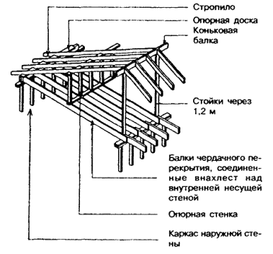 8.2.3 Несущий каркас скатной крыши с уклоном менее 1:3, собираемый на месте 8.2.3.1 В скатных крышах с уклоном менее 1:3 верхние концы стропил следует опирать на коньковую балку сечением не менее 38´140 мм, укладываемую на вертикальные стойки сечением не менее 38´89 мм, которые устанавливаются на обвязку внутренней несущей стены с шагом 1,2 м. При необходимости пролеты коньковой балки между опорными стойками могут быть увеличены. В этом случае сечение коньковой балки в зависимости от пролетов и снеговой нагрузки подбирают по таблице Б.12. 8.2.3.2 В крышах с малым уклоном для образования пространства между верхней обвязкой стен и укладываемым на стропила кровельным настилом, достаточного для размещения в нем утеплителя и вентилируемой воздушной прослойки, нижние опорные концы стропил следует опирать не на верхнюю обвязку стен, а на расположенную выше обвязки опорную доску сечением не менее 38´89 мм (рисунок 8.2). Эта доска укладывается на балки чердачного перекрытия и прибивается к каждой балке. Стропила прибиваются к опорной доске. Рисунок 8.2 - Каркас скатной крыши с уклоном менее 1:3 с промежуточной опорой в виде опорной стенки 8.2.3.3 В случаях, когда определенный участок наружной стены смещен внутрь дома под общей крышей, выступающие за эту стену балки чердачного перекрытия укладываются на обвязку каркаса наружной стены (рисунок 8.3). Свободные концы стропил и этих балок скрепляются между собой внахлест гвоздями в соответствии с первой строкой таблицы 8.1. Рисунок 8.3 - Устройство каркаса скатной крыши при смещенной внутрь дома наружной стене Под стропила на этом участке стены устраивается опорная стенка из вертикальных стоек и уложенной на них обвязки того же сечения, что и каркас наружной стены. Стойки устанавливаются на обвязку наружной стены под каждое стропило. Стропила должны опираться на обвязку опорной стенки и прикрепляться к ней гвоздями. Гвоздевое крепление опорной стенки - по разделу 7. 8.2.3.4 Промежуточной опорой в скатных крышах с уклоном менее 1:3 могут являться опорные стенки с верхней и нижней обвязкой и стойками сечением 38´89 мм, которые устанавливаются в одной плоскости со стропилами и балками чердачного перекрытия и прибиваются к ним гвоздями. Промежуточными опорами могут быть также сжатые раскосы под стропила, которые изготовляются из пиломатериала сечением не менее 38´89 мм и устанавливаются от каждой стропилины к внутренней несущей стене под углом не менее 45° к горизонтали. 8.2.3.5 Гвоздевые крепления элементов каркаса скатных крыш с уклоном менее 1:3 должны выполняться в соответствии с таблицей 8.3. Таблица 8.3