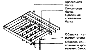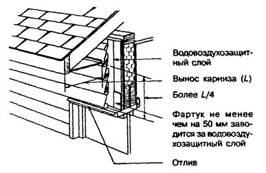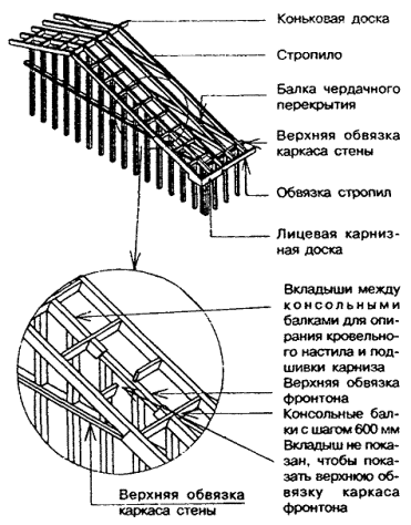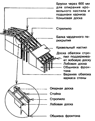 8.4 Устройство фронтонов (торцевых стен) и карнизов над ними в доме со скатной крышей 8.4.1 Шаги и сечения стоек каркаса фронтонов принимаются такими же, как для расположенной под ними наружной стены. Стойки устанавливаются на верхнюю обвязку наружной стены над ее стойками и крепятся так же, как эти стойки. 8.4.2 При устройстве отапливаемой мансарды наружная защитная обшивка и облицовка фронтонной стены выполняются по правилам разделов 9 и 10. 8.4.3 Во фронтонной стене в качестве верхней обвязки каркаса стены при карнизном свесе менее 300 мм используется крайнее стропило (рисунок 8.6), а при большем свесе - обвязочный брус того же сечения, что и стойки стены, устанавливаемый параллельно стропилам, но ниже их с таким расчетом, чтобы на них можно было опереть консольные балки, предусматриваемые в этом случае для крепления кровельного настила и подшивки карниза (рисунок 8.7). Рисунок 8.6 - Карниз над фронтоном с выносом 300 мм и менее Рисунок 8.7 - Карниз над фронтоном с выносом более 300 мм 8.4.4 В случаях, когда утепление фронтона не предусматривается, стойки каркаса фронтона допускается располагать длинной стороной сечения параллельно поверхности стены. 8.4.5 При устройстве карниза с выносом более 300 мм консольные балки, сечение которых принимается таким же, как сечение стропил, располагаются с шагом не более 600 мм и прибиваются в торец к крайнему стропилу и сверху - к обвязочному брусу стены. Между консольными балками по верху обвязочного бруса прибиваются вкладыши, а к торцам консольных балок - лобовая балка того же сечения, что и стропила. 8.4.7 Обшивка фронтона при устройстве карнизного свеса с выносом карниза менее 300 мм должна доводиться до верхней грани стропил, а при выносе карниза более 300 мм - до низа консольных балок. 8.4.8 После устройства кровельного настила и подшивки карниза к лобовой балке (8.4.5) или лобовой доске (8.4.6) прибивается лицевая карнизная доска в соответствии с 8.3.4. 8.4.9 Гвоздевые крепления элементов карнизов следует выполнять в соответствии с таблицей 8.5. Таблица 8.5