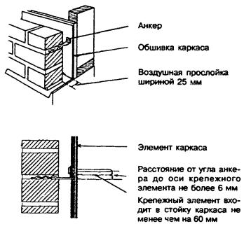 10.3.3.2 Анкеры должны быть изогнуты под прямым углом на расстоянии не более 6 мм от оси отверстия под шуруп и крепиться стойкими к коррозии шурупами диаметром 3,0 мм или оцинкованными гвоздями с насечкой диаметром 3,4 - 3,9 мм, входящими в массив дерева не менее чем на 60 мм. 10.3.4 Опора каменной облицовки 10.3.4.1 Каменная облицовка должна выступать от края опоры не более чем на одну треть толщины облицовки. 10.3.4.2 Пролеты перемычек из стальных прокатных уголков, служащих опорой облицовки над проемами, должны определяться расчетом. Стальные уголки должны быть защищены от коррозии. 10.3.5 Защита от дождевой воды 10.3.5.1 Для защиты каменной облицовки от намокания должны использоваться водоотводящие фартуки, которые могут быть открытого типа (из материалов, устойчивых к непосредственному атмосферному воздействию) и закрытого типа (располагаемые в толще конструкции и менее подверженные указанному воздействию). Кроме того, в облицовочной кладке должны предусматриваться дренажные отверстия. 10.3.5.2 Материалы для изготовления фартуков должны приниматься по таблице 10.2. Таблица 10.2
