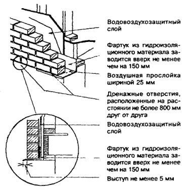 10.3.5.3 На фартук, изготовленный из алюминиевых сплавов, соприкасающийся с каменной кладкой или бетоном (раствором), следует нанести эффективное изолирующее покрытие или проложить между ним и кладкой (бетоном, раствором) водонепроницаемую пленку. 10.3.5.4 Детали для крепления фартука должны обладать коррозионной стойкостью. Металл, из которого они изготовлены, должен быть совместим с металлом фартука: эти изделия не должны быть подвержены электрохимической коррозии. 10.3.5.5 В фартуке, составленном из нескольких полос материала, стыки полос должны выполняться водонепроницаемыми. 10.3.5.6 Фартуки в каменной облицовке стен следует устанавливать: а) под наружными каменными подоконниками-отливами (рисунок 10.2); б) под дренажными отверстиями (рисунок 10.3); в) над оконными или дверными проемами в наружных стенах, если расстояние по вертикали между верхом оконной или дверной коробки и нижним краем карниза (свеса крыши) более одной четверти размера горизонтального выноса карниза. Рисунок 10.2 - Установка фартука под каменным отливом Рисунок 10.3 - Фартук под дренажными отверстиями каменной облицовки Рисунок 10.4 - Фартук над оконным (дверным) проемом 10.3.5.7 Фартуки под наружными отливами окон и над оконными (дверными) проемами в стенах с каменной облицовкой следует размещать от наружной поверхности облицовки в глубь конструкции и отгибать вверх за отлив окна или за перемычку, поддерживающую часть облицовки над проемом. Фартук под оконными отливами допускается не устанавливать, если на нижней поверхности отливов предусмотрен капельник глубиной 10 мм на расстоянии не менее 25 мм от наружной поверхности стены. 10.3.5.8 Фартук под дренажным отверстием в каменной облицовке каркасной стены должен быть установлен таким образом, чтобы один его конец выступал не менее чем на 5 мм за наружную поверхность опоры облицовки, а другой конец был заведен в глубь конструкции и завернут на высоту 150 мм за облицовку в воздушную прослойку между нею и каркасом стены. 10.3.5.9 В стене каркасной конструкции, в которой устраивается водовоздухозащитный слой или наружная защитная обшивка каркаса, отогнутую вверх часть фартука следует заводить за этот слой или обшивку. 10.3.5.10 Дренажные отверстия должны располагаться с шагом не более 800 мм и обеспечивать сообщение с наружным воздухом нижних зон воздушных прослоек, расположенных между кирпичной облицовкой и каркасными стенами. 10.3.5.11 Места сопряжения оконных и дверных коробок с каменной кладкой должны быть загерметизированы в соответствии с указаниями 10.4.4. 10.3.5.12 При кладке каменной облицовки необходимо следить за тем, чтобы упавший в воздушную прослойку раствор не образовывал мостиков между облицовкой и обшивкой стен, позволяющих просочившейся воде проникать внутрь помещений. 10.4 Облицовка наружных стен из различных материалов 10.4.1 Общие требования 10.4.1.1 Настоящий раздел относится к наружным облицовкам стен, выполняемым из пиломатериалов, фанеры, плитных и листовых материалов на основе древесины, асбестоцементных плиток или листов, асбестоцементной кровельной плитки, алюминия, стали. Защита наружных стен от попадания в них дождевой воды и снега наряду с облицовкой обеспечивается водоотводящими фартуками, устройством в необходимых случаях воздушных прослоек, герметизацией сопряжений элементов стен. 10.4.1.2 Облицовка из древесн