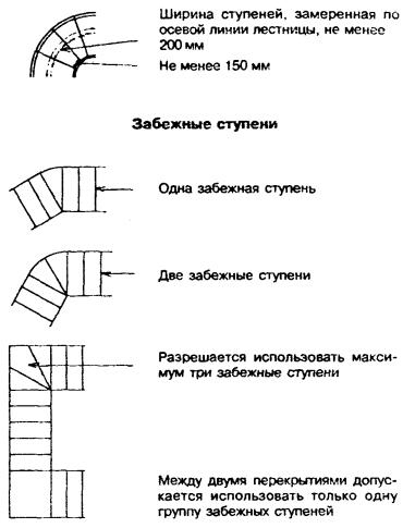 Ступени должны иметь одинаковую высоту, а проступи - одинаковую ширину в любом одном лестничном марше. Закругленные или скошенные края ступеней не должны уменьшать глубину проступи более чем на 15 мм. 12.2.1.5 Количество ступеней в одном лестничном марше не должно превышать 18. 12.2.2 Лестничные площадки и площадки перед лестницами 12.2.2.1 Лестничные площадки на внутренних лестницах следует предусматривать в случаях, когда к лестнице примыкает дверной проем, а также в случаях, когда устраивается промежуточная площадка для облегчения подъема по лестнице или для изменения направления движения по лестнице. 12.2.2.2 Ширина и длина лестничных площадок должна быть не менее ширины лестницы. 12.2.2.3 Ширина дверного проема, выходящего на площадку внутренней лестницы, не должна превышать ее ширину, при этом, если дверь открывается в сторону лестницы, полная дуга поворота дверного полотна должна вписываться в размеры лестничной площадки. 12.2.2.4 В случаях, когда вверху или внизу лестницы в непосредственной близости к ней располагается дверной проем, перед входом на лестницу должна предусматриваться площадка, размеры которой должны назначаться аналогично размерам лестничных площадок. 12.2.2.5 На верху всех наружных лестниц следует предусматривать площадки, ширина которых не должна быть менее ширины открывающихся на них входных дверей. 12.2.3 Криволинейные лестницы и забежные ступени 12.2.3.1 В криволинейных лестницах ширина проступи в середине ступени должна быть не менее 200 мм, а в узкой части - не менее 150 мм. 12.2.3.2 В лестнице с забежными ступенями (ступени, которые сходятся в центральной точке) между уровнями смежных перекрытий допускается только один поворот с использованием забежных ступеней. 12.2.3.3 Участок лестницы с забежными ступенями не должен иметь угол поворота более 90°, а угол между отдельными забежными ступенями должен составлять не менее 30°. Поэтому разрешается использовать не более трех забежных ступеней (рисунок 12.1). Криволинейная лестница Рисунок 12.1 - Криволинейные лестницы и лестницы с забежными ступенями 12.2.4 Пандусы 12.2.4.1 Уклон пандуса, устроенного внутри дома, не должен превышать 1:10, устроенного снаружи - 1:12. 12.2.4.2 Ширина внутреннего пандуса должна быть не менее ширины примыкающих коридоров лестниц и дверных проемов, а наружного - 1 м. 12.2.4.3 В местах примыкания стеновых проемов к боковой стороне пандуса необходимо предусматривать площадки с шириной, равной ширине пандуса, и длиной, превышающей ширину проема на 300 мм с каждой его стороны. 12.2.4.4 В местах примыкания стеновых проемов к торцам пандуса необходимо предусматривать площадки с шириной, равной ширине пандуса, и длиной не менее 900 мм 12.3 Конструкция лестниц 12.3.1 Наружные бетонные лестницы 12.3.1.1 Наружная бетонная лестница с более чем двумя подступенками и двумя проступями может опираться на: кирпичные или бетонные стены; простенки с поперечным сечением не менее 150 мм; выступающие из фундаментной стены дома консоли. 12.3.1.2 При опирании лестницы на консоли необходимы меры предосторожности во время засыпки и выравнивания для предотвращения повреждения лестницы в результате замерзания и вспучивания грунта. 12.3.1.3 Глубина заложения фундаментов под наружные бетонные лестницы должна соответствовать требованиям раздела 5 настоящего Свода правил. 12.3.1.4 Консольные бетонные ступени должны крепит