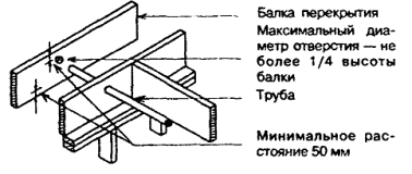 6.3 Опирание внутренних стен и перегородок на каркас перекрытия 6.3.1 Перегородки должны опираться на черный пол. Перегородка, располагаемая параллельно балкам перекрытия, но между ними, должна через черный пол опираться на деревянные распорки между балками (рисунок 6.13). Рисунок 6.13 - Опирание перегородок 6.3.2 Деревянные распорки для опоры перегородок должны выполняться из брусков сечением не менее 38´89 мм и устанавливаться через 1,2 м. 6.3.3 Перегородки, устанавливаемые под прямым углом к балкам перекрытия, могут размещаться произвольно, по выбору заказчика. 6.3.4 Несущие внутренние стены должны через черный пол опираться на прогоны или на расположенные ниже несущие стены. Допускается несущие внутренние стены, расположенные под прямым углом к балкам перекрытия, устанавливать на расстоянии не более 900 мм от опоры балок, если на них опирается только чердачное перекрытие (при неэксплуатируемом чердаке), и не более 600 мм от опоры балок, если на них передается нагрузка от одного или более междуэтажных перекрытий. При необходимости смещения стены на большее расстояние от опор размер сечения балок должен приниматься на основании расчета. 6.4 Черные полы 6.4.1 Черные полы следует устраивать под покрытие пола, если оно не обладает достаточной прочностью для восприятия расчетных нагрузок. 6.4.2 Черные полы устраивают из: фанеры по ГОСТ 11539, ГОСТ 3916.1 или ГОСТ 3916.2; пиломатериалов хвойных пород по ГОСТ 24454; цементно-стружечных плит марки ЦСП-1 по ГОСТ 26816; древесностружечных плит нешлифованных, повышенной водостойкости, класса эмиссии формальдегида Е1 по ГОСТ 10632; гипсоволокнистых плит по ГОСТ Р 51829. Допускается использовать другие материалы, не уступающие перечисленным по прочности и жесткости и разрешенные для применения в строительстве жилых зданий. 6.4.3 Толщина черного пола должна соответствовать таблице 6.2. Таблица 6.2