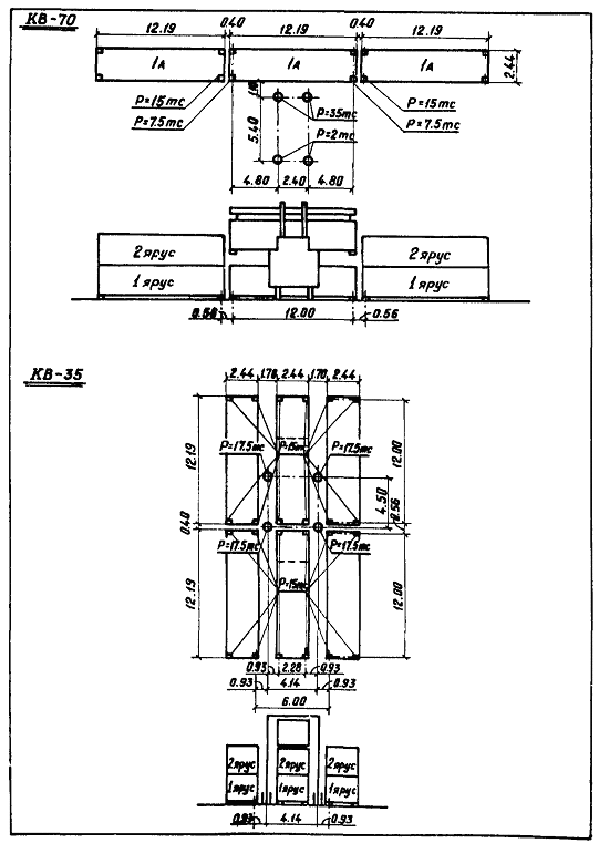 Примечания: 1. Нормативная нагрузка - произведение величины статической нагрузки на коэффициент динамичности, равный 1,15. 2. Расчетное давление - результат деления расчетной нагрузки, равной по величине нормативной, на площадь отпечатка колеса. 3. Для операционной зоны принимают нагрузки по схемам КВ-70 или КВ-35, для проездов - по схеме Тc. 2.2. Нормативные нагрузки на покрытия площадок многоярусного (более двух) складирования контейнеров определяют в зависимости от количества устанавливаемых в ярусы контейнеров. 2.3. Расчетную нагрузку от многоярусного складирования контейнеров, воспринимаемую фитингом площадью поперечного сечения, (0,0225 м2) вычисляют по формуле Pp = Pngfg1c, где Р - нормативная нагрузка на фитинг при складировании контейнеров (определяют по табл. 2 в зависимости от количества ярусов); gf - коэффициент надежности по нагрузке, равный единице; g1c - коэффициент, учитывающий степень полноты загрузки контейнеров (принимают равным 0,9, 0,8 и 0,7 для групп контейнеров, устанавливаемых в 3, 4 и 5 ярусов соответственно). 2.4. Схемы взаимного расположения технологического транспорта и контейнеров, а также расстановки контейнеров при их многоярусном складировании приведены на рис. 1 и 2. Таблица 2