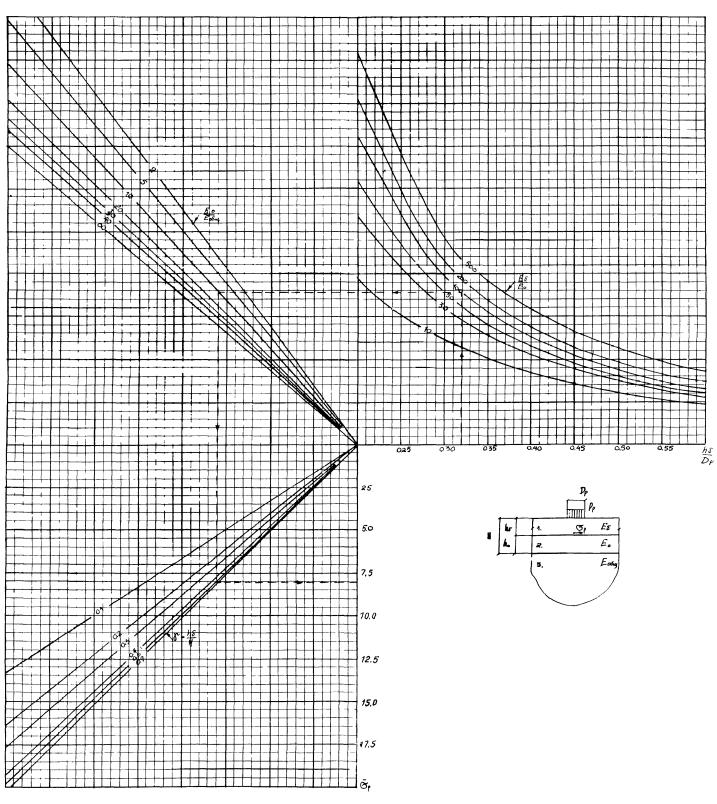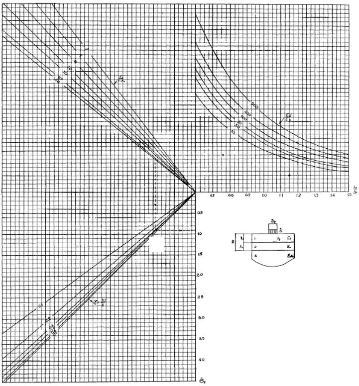 Рис. 3. Номограмма для определения максимальных растягивающих напряжений при изгибе неограниченной в плане плиты на упругом двухслойном основании (hб/Dр = 0,20 ¸ 0,60): 1 - бетонное покрытие; Еб, mб, hб - соответственно модуль упругости, коэффициент Пуассона, толщина бетонного покрытия; 2 - верхний слой основания; Ео, mо, hо - соответственно модуль упругости, коэффициент Пуассона, толщина слоя; 3 - многослойное основание; Еобщ, Мобщ - соответственно модуль упругости, коэффициент (общий) Пуассона основания
