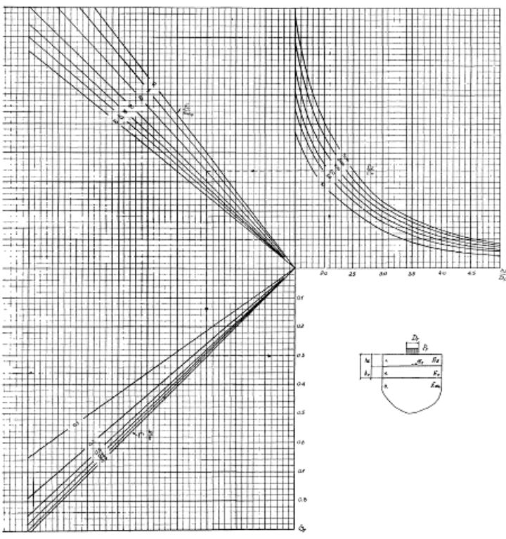 Рис. 4. Номограмма для определения максимальных растягивающих напряжений при изгибе неограниченной в плане плиты на упругом двухслойном основании (hб/Dр = 0,60 ¸ 1,50) Рис. 5. Номограмма для определения максимальных растягивающих напряжений при изгибе неограниченной в плане плиты на упругом двухслойном основании (hб/Dр = 1,5 ¸ 5,0) СОДЕРЖАНИЕ