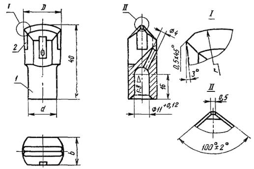 Постановлением Государственного комитета стандартов Совета Министров СССР от 3/VI 1971 г. № 1072 срок введения установлен с 1/1 1973 г. Несоблюдение стандарта преследуется по закону 1. Настоящий стандарт распространяется на долотчатые твердосплавные коронки для бурения отверстий в бетоне и железобетоне (с принудительным удалением буровой мелочи) ручными электрическими перфораторами с энергией удара до 5 Дж. 2. Основные размеры коронок должны соответствовать указанным на чертеже и в таблице. 1 - корпус коронки; 2 - пластинка твердосплавная по технической документации, утвержденной в установленном порядке мм
