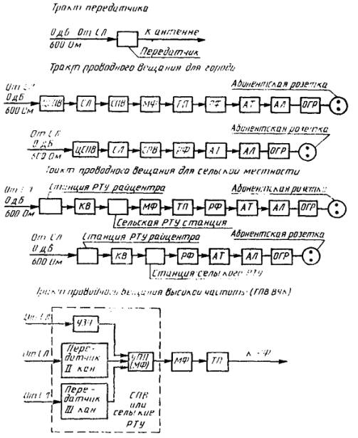 Дата введения 01.07.92 Настоящий стандарт распространяется на действующие каналы и тракты звукового вещания и передачи звуковых сигналов телевидения: аналоговые каналы и тракты с полосой частот до 15, 10,7 и 6,4 (6,3) кГц, цифровые каналы звукового вещания с полосой частот до 15 и 7 кГц, вновь вводимые высокочастотные тракты трехпрограммного проводного вещания и устанавливает нормы на их основные параметры качества. Стандарт не распространяется на каналы подачи программ на одной боковой полосе через коротковолновые передатчики и системы звукового вещания по абонентским городским и сельским телефонным линиям. 1. ОБЩИЕ ПОЛОЖЕНИЯ1.1. Электрический канал звукового вещания и передачи звуковых сигналов телевидения (в дальнейшем звукового вещания) представляет собой совокупность технических средств, при помощи которых электрические сигналы звукового вещания передаются с выхода микрофона или канала воспроизведения магнитофона до антенны передатчика или абонентской розетки тракта проводного вещания (*). 1.2. Электрический канал звукового вещания (черт. 1) состоит из тракта формирования программ и трактов первичного и вторичного распределения программ. 1.3. Тракт формирования программ (ТФП)** представляет собой часть электрического канала звукового вещания, которая начинается на выходе микрофона или канала воспроизведения магнитофона и заканчивается на выходе центральной аппаратной (АЦ) радиодома, телецентра, радиотелецентра (черт. 2)*. * После разработки государственного стандарта на параметры качества магнитофонов и методов их измерений тракт формирования программ должен начинаться на входе канала воспроизведения магнитофона (черт. 2). ** Полный перечень сокращений, терминов и их пояснений приведен в приложении 1. Электрический канал звукового вещания Черт. 1 Типовой тракт формирования программ Черт. 2 Для передачи звуковых сигналов телевидения тракт формирования программ заканчивается на выходе соединительной линии (СЛ) от АЦ. Нормы на параметры качества канала воспроизведения магнитофона приведены в приложении 5. 1.4. Тракт первичного распределения программ звукового вещания представляет собой часть электрического канала звукового вещания, которая начинается на выходе АЦ радиодома и заканчивается выходом СЛ от коммутационно-распределительной аппаратной (КРА), междугородного канала звукового вещания (МКЗВ) к тракту вторичного распределения или к АЦ радиодома. Тракт первичного распределения звуковых сигналов телевидения представляет собой часть электрического канала, звукового вещания, которая начинается на выходе СЛ от АЦ и заканчивается выходом СЛ от МКЗВ к тракту вторичного распределения или к АЦ. Типовые тракты первичного распределения программ представлены на черт. 3 и 4. В состав тракта первичного распределения программ звукового вещания входят: коммутационно-распределительные аппаратные, соединительные линии и междугородный канал звукового вещания. В состав тракта первичного распределения звуковых сигналов телевидения входят: междугородный канал звукового вещания и соединительная линия. В состав тракта первичного распределения местного звукового вещания, предназначенного для распределения программ звукового вещания населению города от тракта формирования радиодома или радиотелецентра данного города, вх