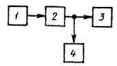 где U1, U2, U3 - соответственно величины напряжения основного сигнала и его второй и третьей гармоник. Измерения проводят на частотах 40, 63, 125, 250, 500, 1000 (800), 2000, 4000 Гц - для трактов (звеньев) с полосой частот до 15 кГц; 100 (63), 125, 250, 500, 1000 (800), 2000 Гц - для трактов (звеньев) с полосой частот до 10 и 6,4 (6,3) кГц*. * Допускается для трактов проводного вещания проводить измерения на абонентской розетке на частоте 1 и 4 кГц. В КЗВ, содержащих устройства частотного предыскажения (ПК-ВК), измерения проводят на частоте 800 Гц. В цифровых КЗВ измерения проводят на частоте 2,1 кГц. 3.3.5. Измерение взвешенного шума производят по схеме, приведенной на черт. 14. 1 - резистор - эквивалент сопротивления источника; 2 - измеряемый тракт или звено; 3 - номинальное сопротивление нагрузки - резистор; 4 - псофометр Черт. 14 Вход тракта (звена) загружают сопротивлением (600±30) Ом. Взвешенный шум измеряют псофометром, выполненным в соответствии с Рек. 468-4 МККР или Р.53 МККТТ, амплитудно-частотные характеристики взвешивающих фильтров которых приведены на черт. 10 и 11**. ** При измерении невзвешенного шума отключают взвешивающий фильтр псофометра. Низкочастотные компандеры в КЗВ должны быть выключены. При этом измеренная величина защищенности от шума может быть меньше на величину защищенности от шума, создаваемого этими компандерами. Для КЗВ, образованных аппаратурой АВ 2/3, эта величина составляет 11 дБ. Защищенность (А) от взвешенного шума вычисляют по формуле A = Nмакс.сигн - Nш, где N макс. сигн - максимальный уровень сигнала; Nш - измеренный уровень шума или