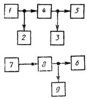 где Uмакс. сигн - максимальное напряжение сигнала; Uш - напряжение шума. 3.3.6. Защищенность максимального сигнала от внятных переходных помех измеряют по схеме, приведенной на черт. 15. 1 - низкочастотный генератор сигналов; 2, 3 - вольтметры; 4 - тракт, вносящий помеху; 5, 6 - номинальное сопротивление нагрузки - резистор; 7 - резистор - эквивалент сопротивления источника; 8 - испытуемый тракт; 9 - анализатор спектра или селективный вольтметр Черт. 15 1 - низкочастотный генератор сигналов; 2 - вольтметр; 3 - канал А; 4 - канал В; 5, 6 - номинальное сопротивление нагрузки - резистор Черт. 16 Защищенность максимального сигнала от внятных переходных помех определяют на частоте 1000 (800) Гц*,**. * Для трактов проводного вещания на частоте 2000 Гц. ** В зависимости от характеристик контуров ПК-ВК допускается изменять измерительную частоту. На вход влияющего тракта (звена) подают измерительный сигнал с номинальным максимальным уровнем. Выход влияющего тракта (звена) и вход тракта (звена), подверженного влиянию, нагружают сопротивлением (600±30) Ом. Длительность подачи сигнала не должна превышать 5 с. На выходе тракта (звена), подверженного влиянию, измеряют уровень внятной переходной помехи анализатором спектра или селективным вольтметром. Низкочастотные компандеры и автокомпенсаторы в КЗВ должны быть выключены. Учитывая, что в каналах ЗВ, образованных аппаратурой АВ 2/3, создаваемый компандером или автокомпенсатором выигрыш в помехозащищенности при малых уровнях сигнала составляет 20 или 17 дБ, измеренное значение защищенности может быть ниже на указанную величину. Защищенность (А) от внятных переходных помех вычисляют по формуле:
