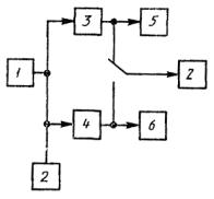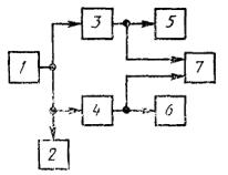 к соотношению для fd Измерения проводят по схеме, приведенной на черт. 18. На вход канала звукового вещания подают измерительный сигнал уровнем 0 дБм0з с точностью не хуже ±0,1 дБ. Коэффициент гармоник генератора звуковых частот не должен превышать 0,3 от минимального значения коэффициента гармоник измеряемого канала звукового вещания. Частота измерительного сигнала устанавливается с точностью не хуже 0,1 % от частоты дискретизации f0. 1 - низкочастотный генератор сигналов; 2 - вольтметр; 3 - канал А; 4 - канал В; 5, 6 - номинальное сопротивление нагрузки - резистор; 7 - фазометр Черт. 17 1 - генератор НЧ сигналов; 2 - селективный вольтметр; 3 - частотомер; 4 - канал звукового вещания (КЗВ); 5 - анализатор спектра или селективный вольтметр Черт. 18 Величину защищенности (А) вычисляют по формуле для внутриполосной перекрестной модуляции: